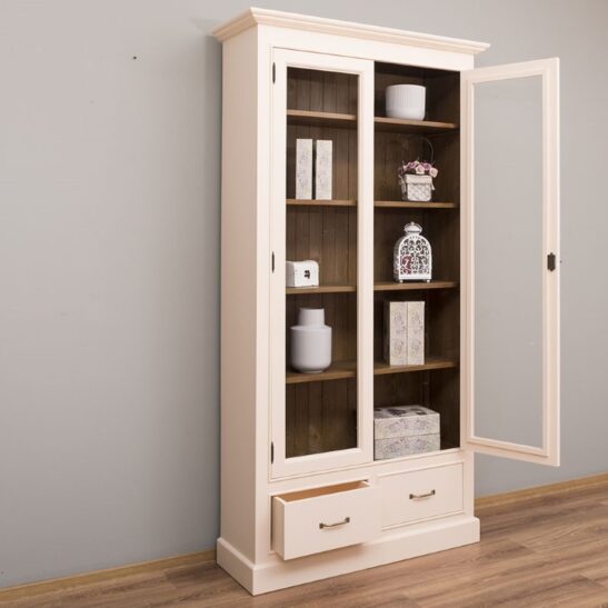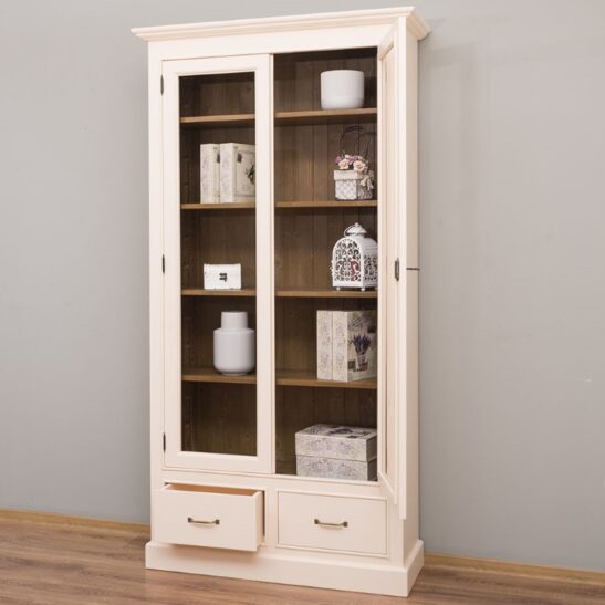 Vitrine en pin massif de 110 cm de large, dotée de deux portes vitrées et de deux tiroirs en partie basse, conçue pour offrir à la fois exposition et rangement; sa structure en pin garantit robustesse et longévité tandis que les vitrages protègent vos collections de la poussière tout en les mettant en valeur; idéale pour la vaisselle, les livres ou les objets décoratifs, cette vitrine combine fonctionnalité et esthétisme grâce à des ferrures solides et des tiroirs pratiques pour les accessoires; disponible avec un choix de finitions pour harmoniser le meuble à votre intérieur, livraison et options de montage proposées, entretien simple par dépoussiérage régulier et application occasionnelle de produits d’entretien adaptés au bois pour préserver la beauté naturelle du pin massif.