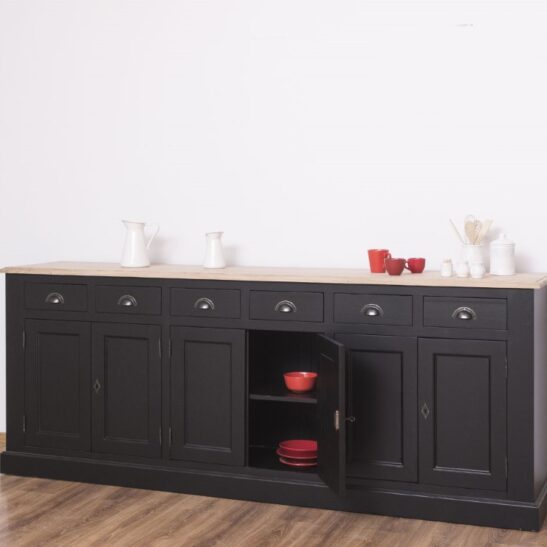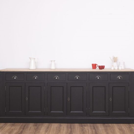 Grand buffet bas en pin massif de 239 cm de largeur, 93 cm de hauteur et 47 cm de profondeur, conçu pour allier capacité de rangement et style intemporel. Il offre six tiroirs coulissants munis de poignées coquille en laiton et trois placards verrouillables avec étagères pour organiser vaisselle, linge et accessoires, le tout sur une structure robuste en bois massif. Proposé brut pour une personnalisation DIY ou réalisé avec nos finitions professionnelles (peintures, cires, patines), ce buffet se combine facilement avec d’autres pièces pour créer un ensemble harmonieux dans la salle à manger ou le séjour. Fabrication et aménagements adaptables sur demande pour modification des dimensions, des couleurs ou de la configuration intérieure. Livraison estimée sous 4 à 8 semaines, devis sur demande pour toute personnalisation avancée