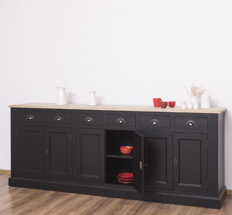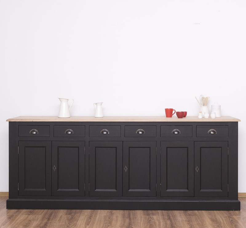 Buffet bas en pin massif 239 cm — 6 portes, 6 tiroirs