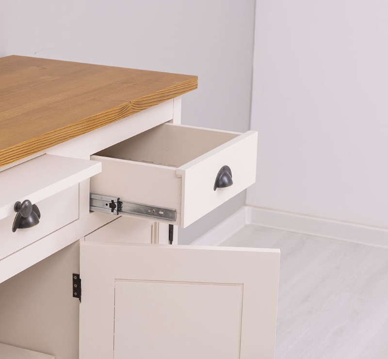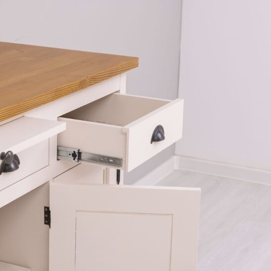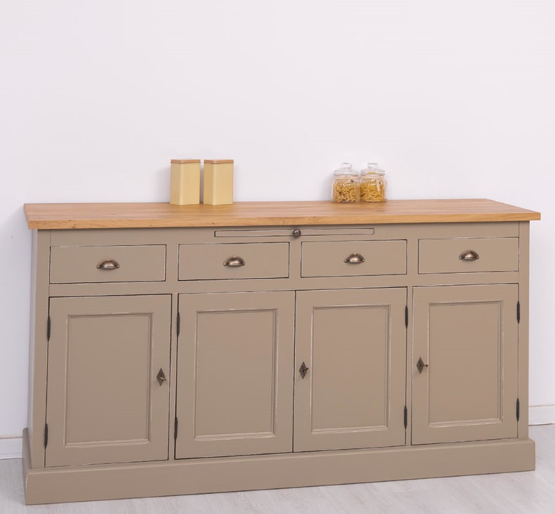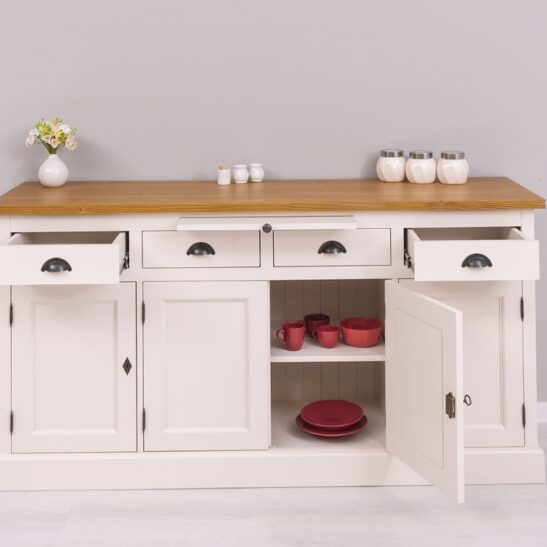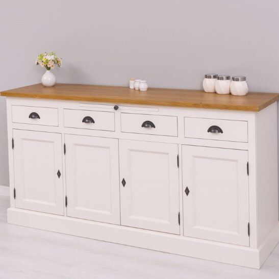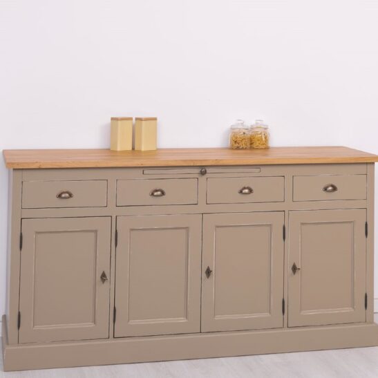 Buffet bas en pin massif de largeur 176 cm, hauteur 90 cm et profondeur 50 cm, conçu pour allier robustesse et fonctionnalité; structure entièrement en pin massif, base solide garantissant une stabilité durable, plateau en pin massif et planche coulissante intégrée idéale comme plan de travail supplémentaire ou pour servir directement; grand volume de rangement avec 4 portes d’armoire verrouillables et 4 tiroirs pour organiser vaisselle, ustensiles et provisions; finitions personnalisables — brut, lasuré, peint ou vernis — et possibilité d’adapter dimensions et aménagements pour s’intégrer parfaitement à votre cuisine ou salle à manger; fabrication soignée, lignes classiques adaptées aux intérieurs intemporels et usage quotidien