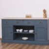 Enfilade en pin massif bleu orage et blanc plateau chêne ouvrant à 4 portes et 8 tiroirs Largeur 239cm