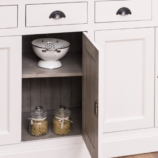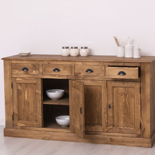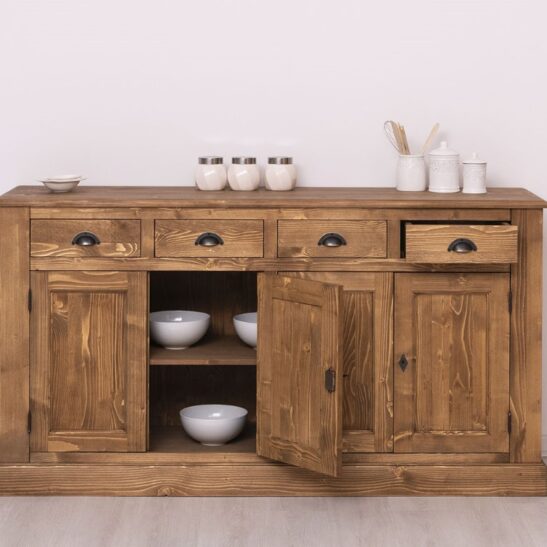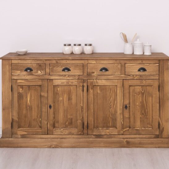 Buffet bas en pin massif de 173 cm, conçu pour allier robustesse et élégance; il offre quatre portes et quatre tiroirs pour un rangement optimisé et organisé, une structure en bois massif soigneusement sélectionnée, des assemblages renforcés et une quincaillerie durable pour une longue tenue dans le temps; surface poncée et protégée pour un entretien facile au chiffon doux; design intemporel adapté au salon, à la salle à manger ou à l’entrée, avec un plateau suffisamment large pour décorer ou poser des appareils légers; possibilité de le personnaliser soi‑même ou de choisir parmi les finitions proposées sur notre site pour l’adapter parfaitement à votre intérieur; livré avec notice de montage claire et conseils d’entretien pour préserver sa beauté.