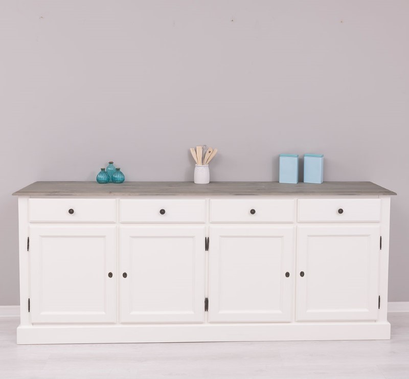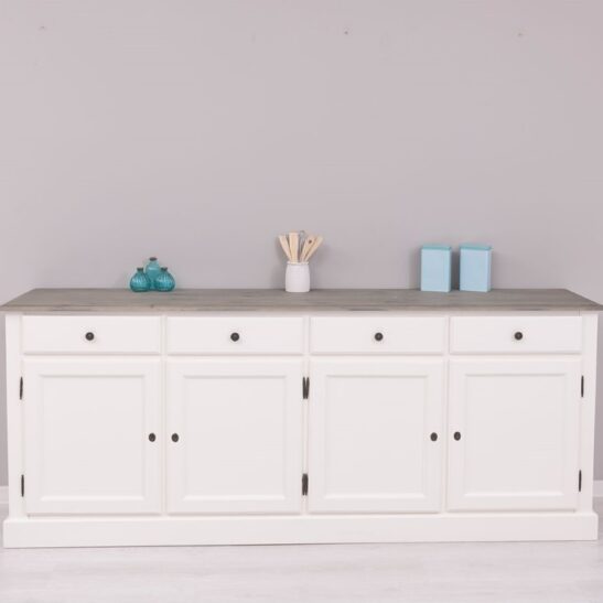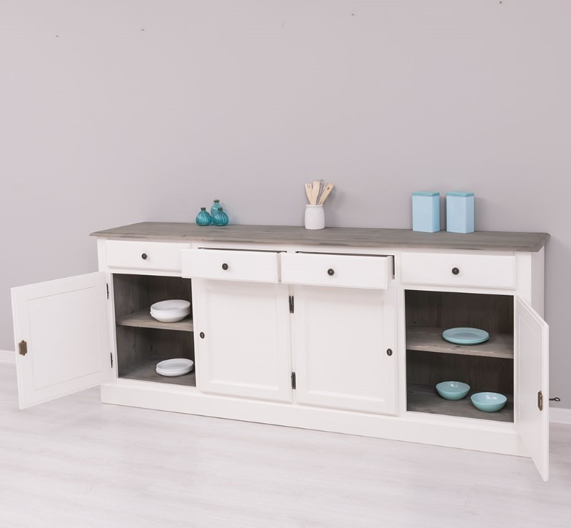 Doté de quatre portes et de quatre tiroirs spacieux, ce meuble de rangement permet d’organiser vaisselle, linge de table, documents ou objets du quotidien avec une grande facilité. Les volumes généreux assurent une capacité de stockage optimale tout en conservant une silhouette harmonieuse et épurée.