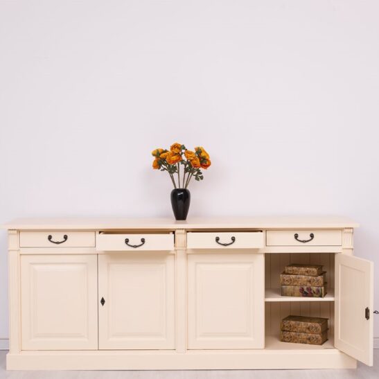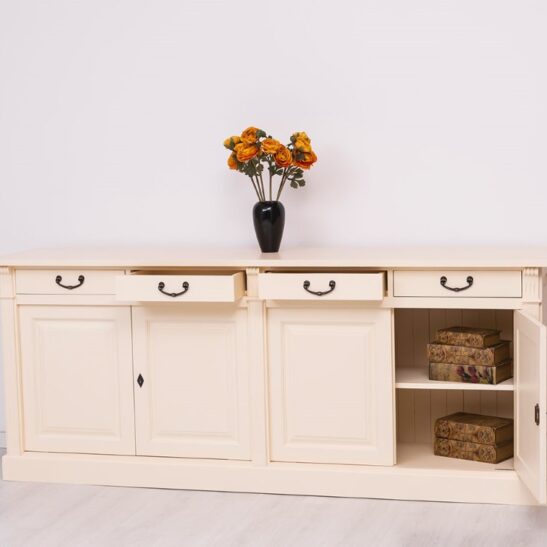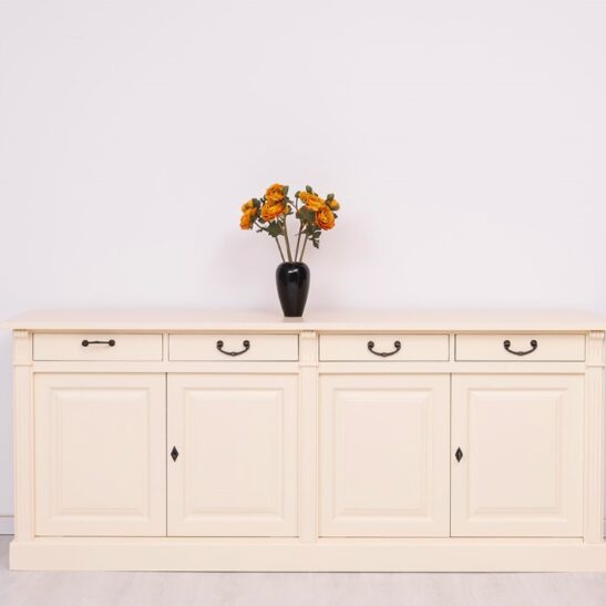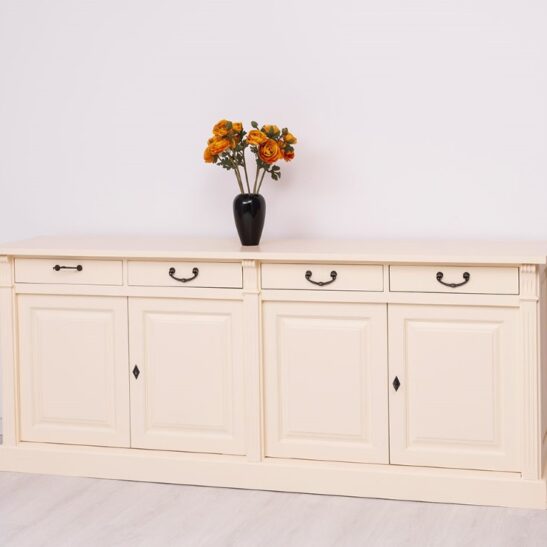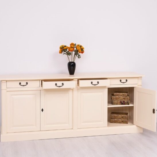 Buffet en pin massif de 219 cm de largeur alliant robustesse et élégance, conçu pour organiser et sublimer votre intérieur. Sa structure pleine en bois massif garantit durabilité et patine naturelle avec le temps. Quatre portes et quatre tiroirs offrent une capacité de rangement généreuse pour vaisselle, linge de maison et objets décoratifs, tandis que l’assemblage traditionnel assure une stabilité à long terme. Disponible brut à peindre ou avec les finitions proposées sur notre site — vernis transparent pour préserver le veinage, lasure pour une teinte chaleureuse, peinture pour une couleur satinée ou cire pour une finition douce et naturelle — ce buffet se prête à tous les styles, du rustique au contemporain. Chaque surface peut être ajustée selon vos préférences pour harmoniser meuble et pièce de vie. Montage soigné, poignées élégantes et charnières renforcées complètent un meuble pensé pour un usage quotidien exigeant. Idéal pour salle à manger, séjour ou entrée, ce buffet offre une solution pratique et esthétique pour structurer vos rangements sans sacrifier le style.