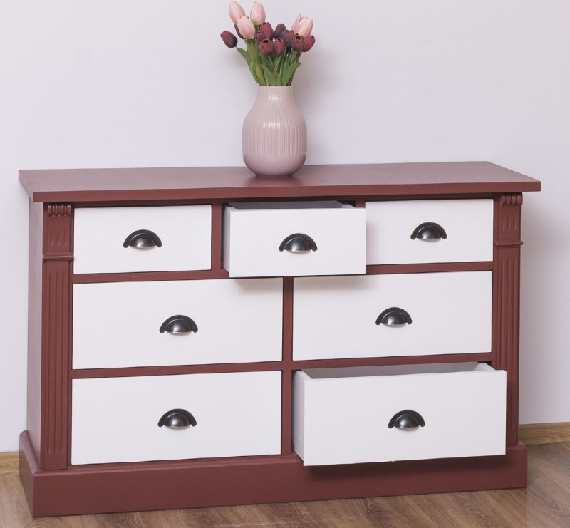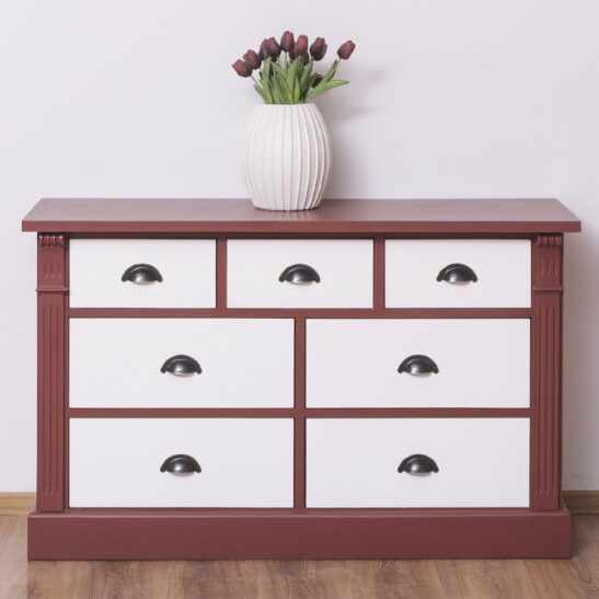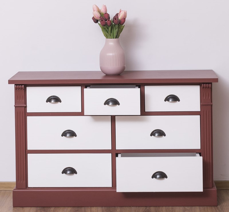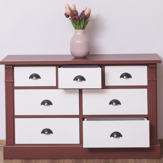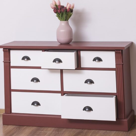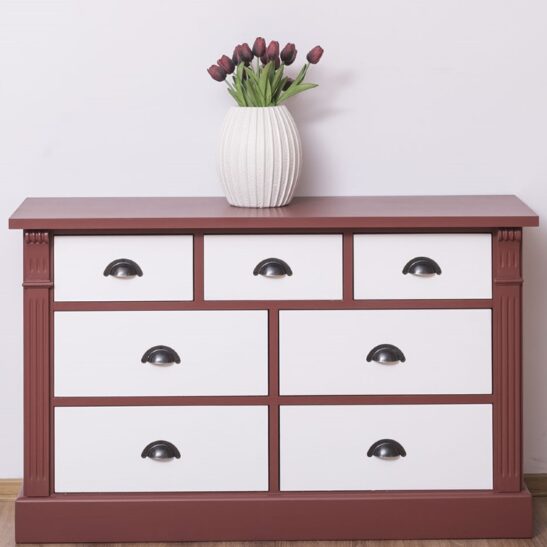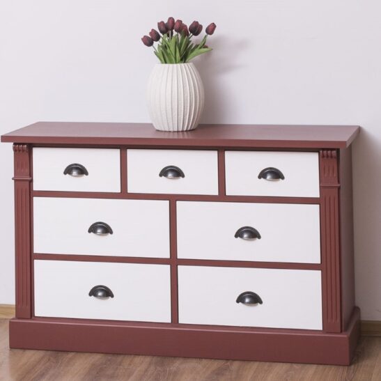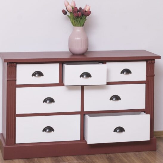 Commode apothicaire en pin massif 122 cm, 7 tiroirs, conçue pour allier esthétique vintage et solidité durable. Fabriquée en pin massif de qualité, cette commode offre une structure stable, un plateau résistant et des tiroirs spacieux équipés de glissières fiables pour un usage quotidien. Son design s’inspire des meubles d’apothicaire traditionnels, apportant une touche chaleureuse et authentique à la chambre, l’entrée ou le salon. Les finitions sont disponibles sur notre site pour s’adapter à votre intérieur ou vous pouvez la personnaliser vous-même selon vos envies. Entretien simple : dépoussiérage régulier et nettoyage doux avec un chiffon humide; éviter les produits agressifs pour préserver le bois. Dimensions optimisées pour le rangement tout en restant compacte, cette commode est idéale pour le linge, les accessoires et les objets décoratifs. Commandez un meuble durable, fonctionnel et élégant, livré selon nos conditions et garanti pour une utilisation sereine.