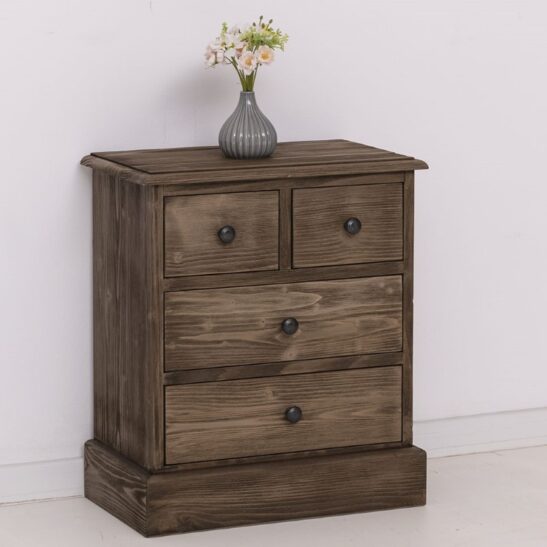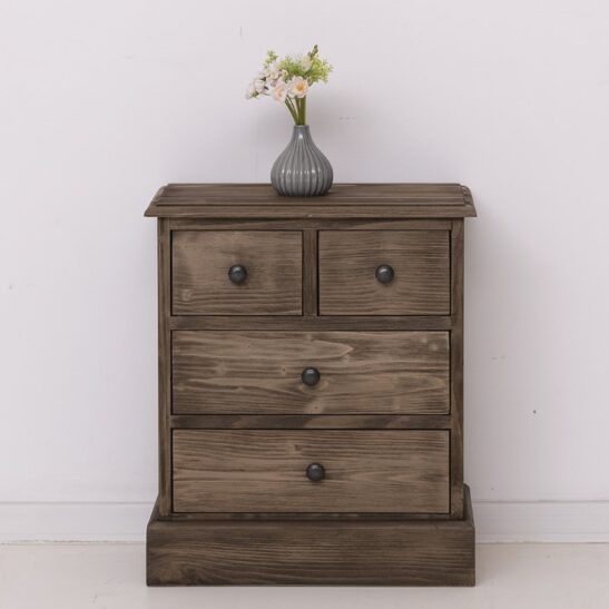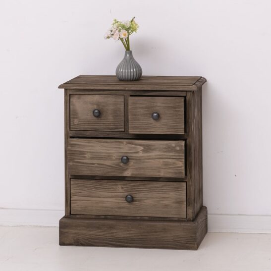 Table de nuit en pin massif au style vintage, conçue pour offrir un grand espace de rangement grâce à ses quatre tiroirs (deux petits sous l’étagère et deux grands en dessous). Sa largeur de 51 cm, hauteur 59 cm et profondeur 30 cm en font un chevet compact et fonctionnel, idéal près du lit pour lampes, livres et objets du quotidien. Le plateau et la structure en pin massif garantissent une finition chaleureuse et une durabilité naturelle ; la pièce peut être livrée dans plusieurs finitions pour s’harmoniser avec votre décoration ou être laissée brute pour une patine personnelle. Fabrication robuste, lignes simples et charme cosy : ce chevet combine praticité et esthétique pour compléter une chambre à coucher au style authentique.