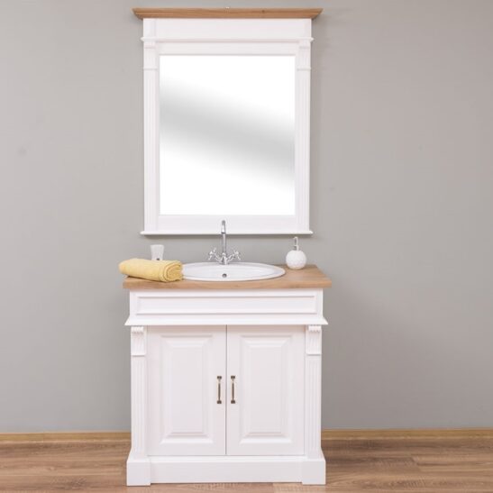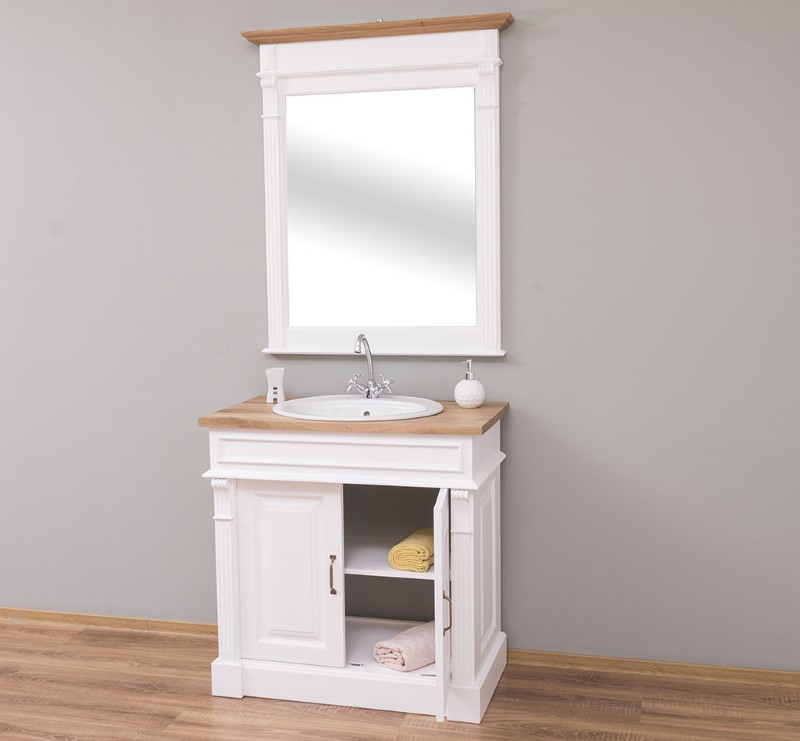 Il y a un placard derrière les 2 portes, idéal pour ranger vos serviettes, gants de toilette ou accessoires de bain. Les fraisages décoratifs témoignent d'un savoir-faire artisanal de grande qualité et lui confèrent son charme typique vintage.