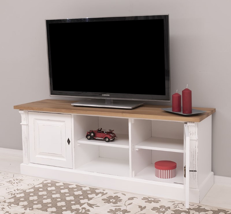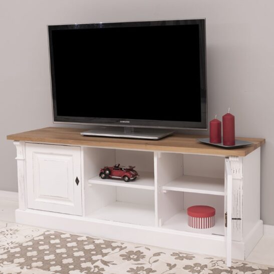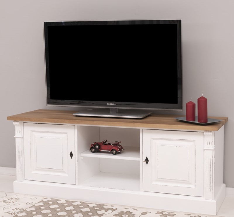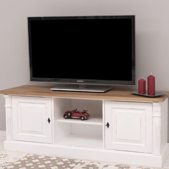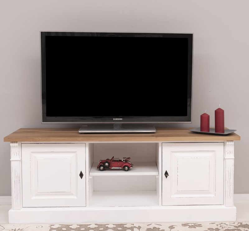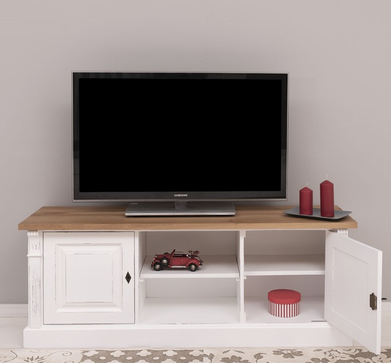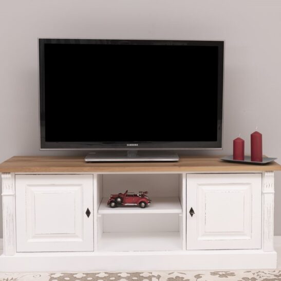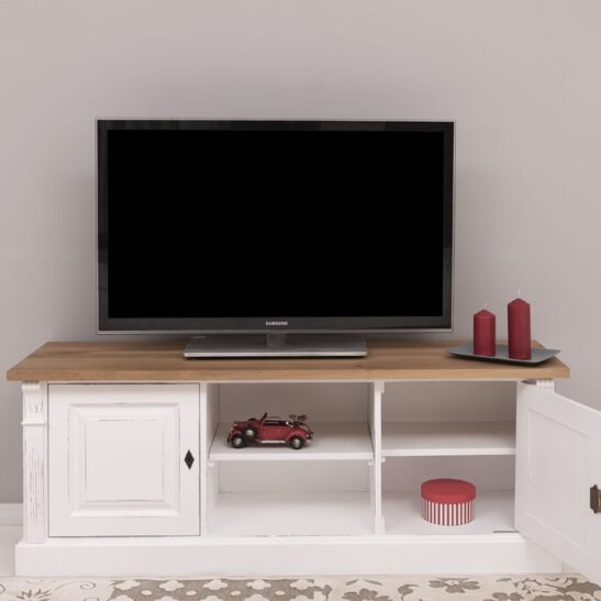 Meuble TV en pin massif 160 cm, deux portes et étagères
