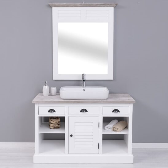 Ce meuble de salle de bain sous vasque en pin massif séduit par son style persienne intemporel et son authenticité naturelle. Conçu pour accueillir une vasque à poser, il offre une solution élégante et fonctionnelle pour aménager une salle de bain chaleureuse et durable.