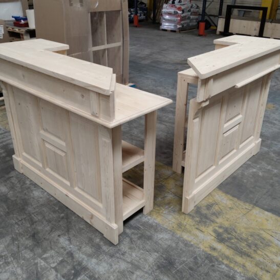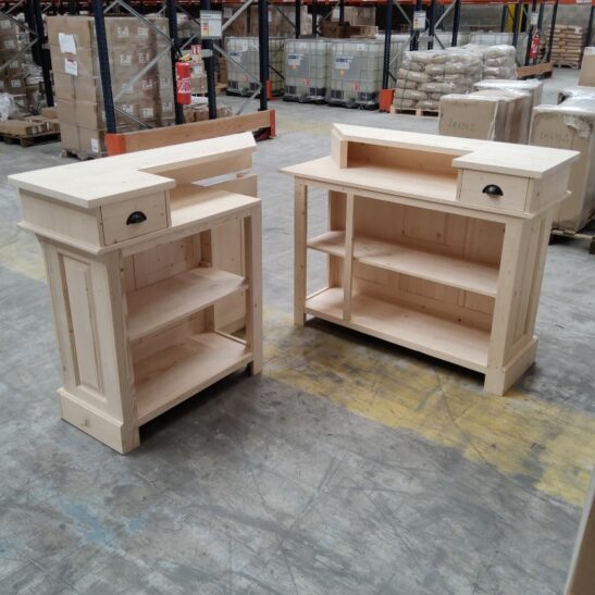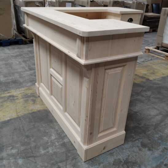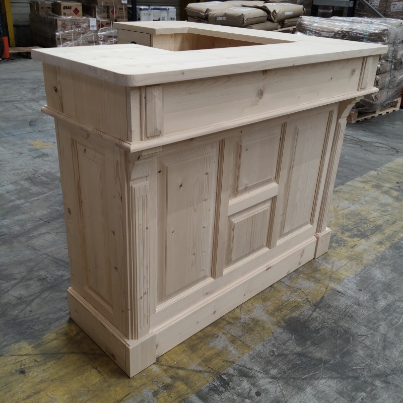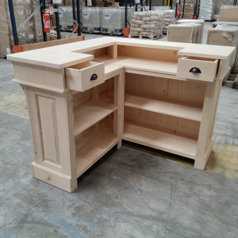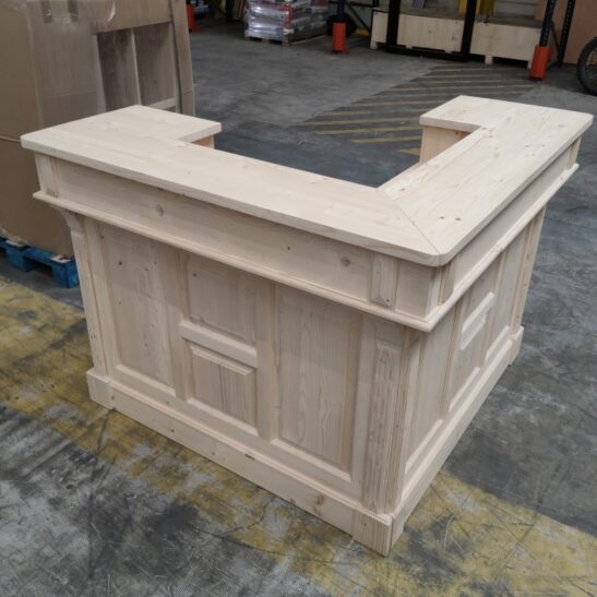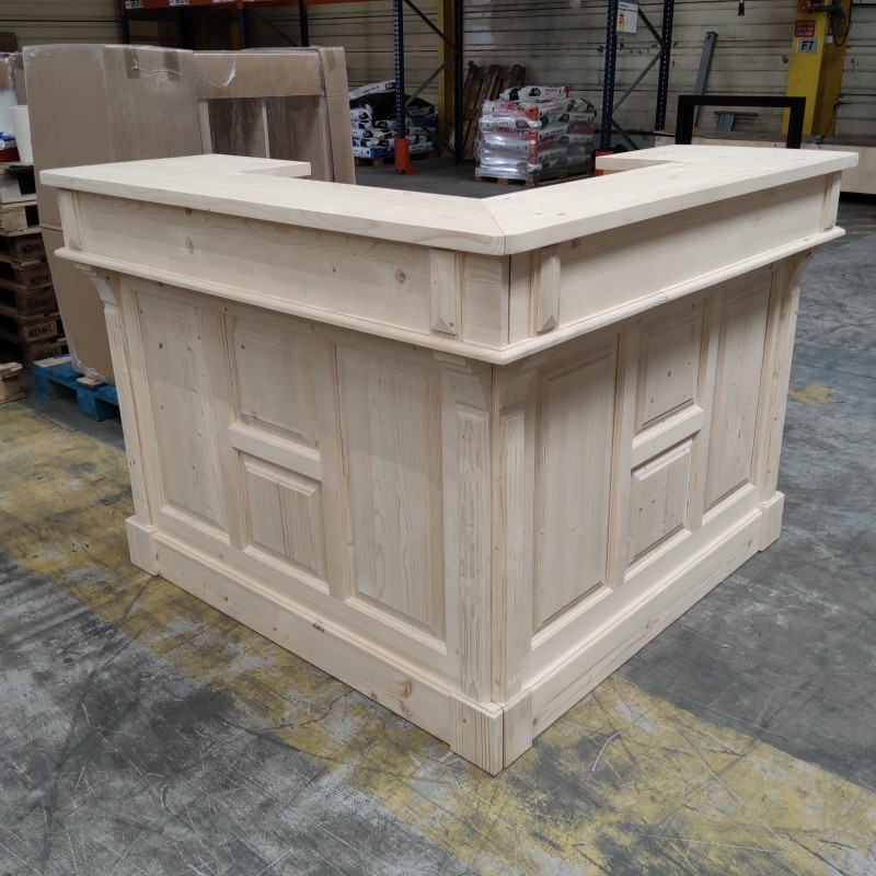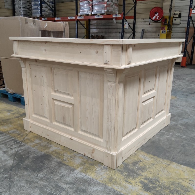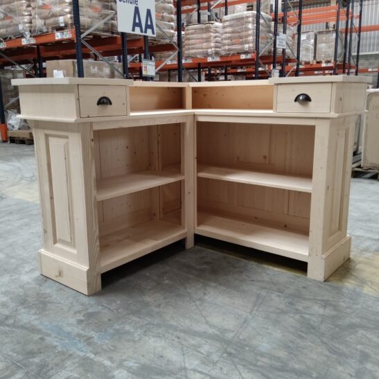 Ce comptoir d’angle en pin massif personnalisable allie charme vintage et fonctionnalité. Conçu pour s’adapter à vos besoins, il peut être réalisé dans la finition et la teinte de votre choix, du bois naturel brut à des couleurs plus audacieuses. Avec ses dimensions généreuses de 140 x 140 cm et sa hauteur de 107 cm, il offre un espace de travail confortable et convivial, idéal pour un bar, une boutique, une banque d’accueil ou une cuisine ouverte. Sa conception en deux modules facilite l’installation et le transport. À l’arrière, quatre grands compartiments et deux tiroirs permettent de ranger verres, ustensiles, boissons ou documents. Le pin massif, robuste et durable, garantit une longue durée de vie, tandis que la personnalisation vous permet de créer un meuble unique, parfaitement intégré à votre décoration. Ce comptoir est la solution idéale pour allier esthétique, praticité et personnalisation.
