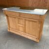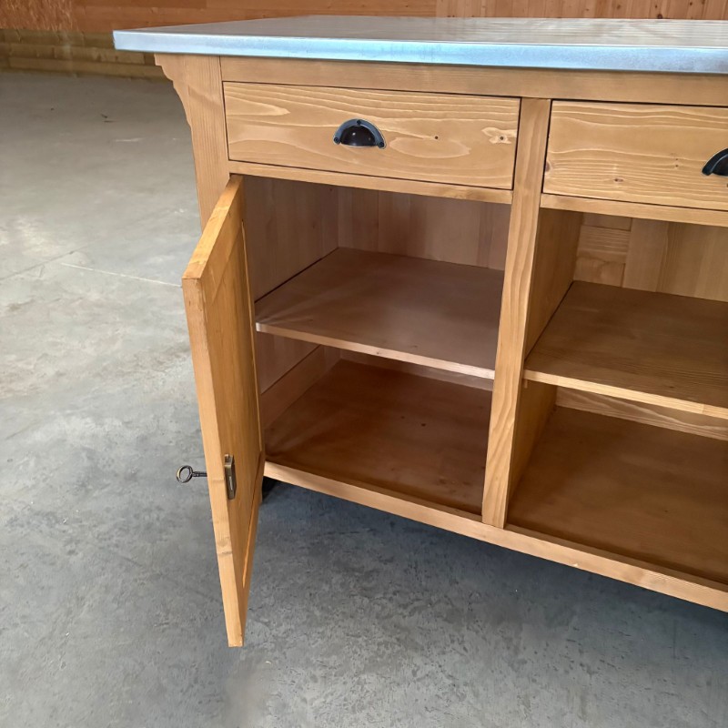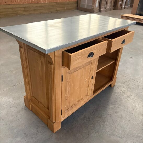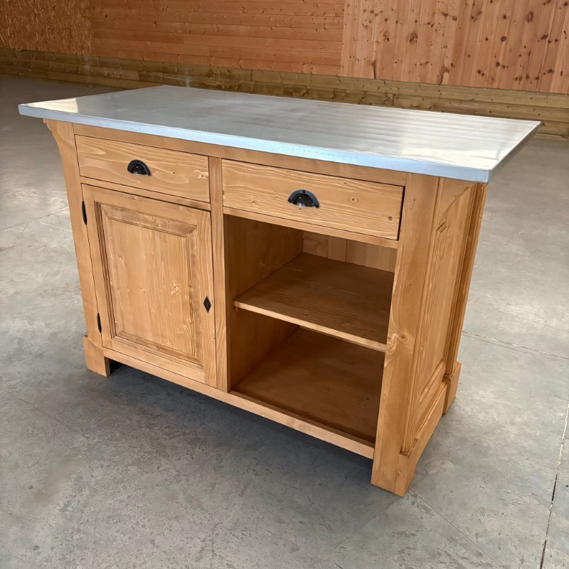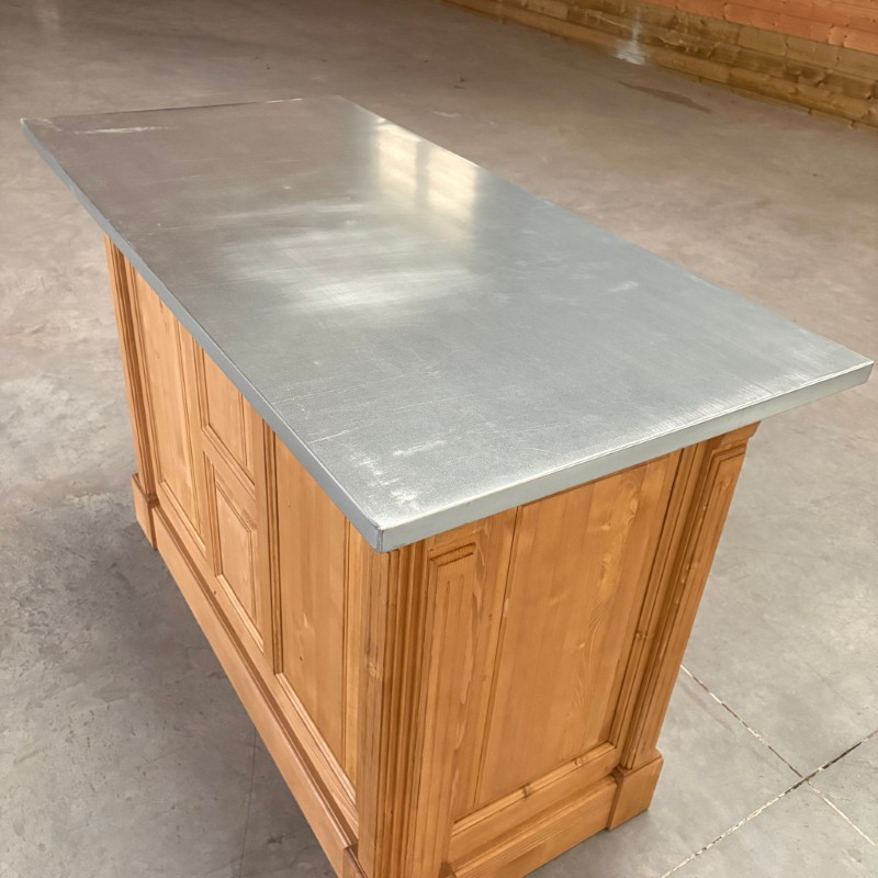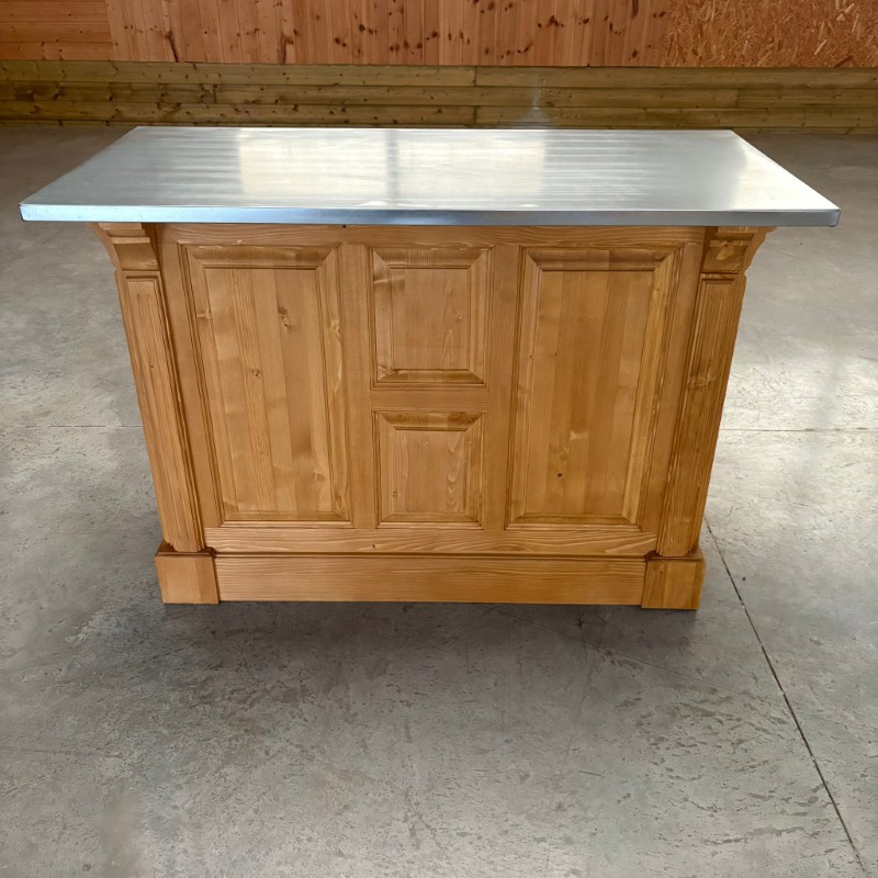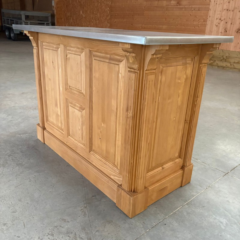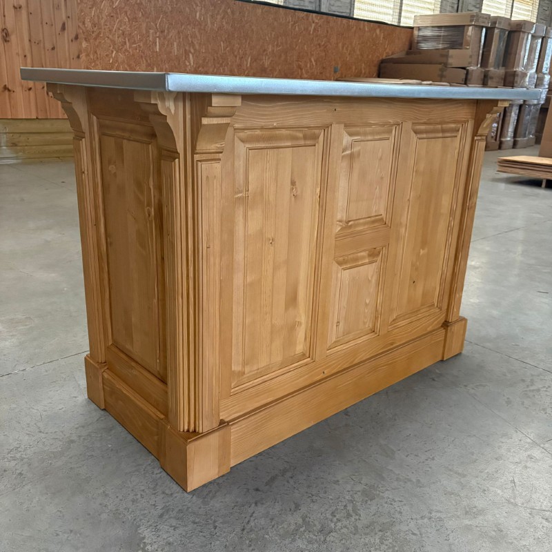 BRISTOL Comptoir îlot 140 cm Vintage en Pin Massif Ciré Brun Clair – plateau zinc acier