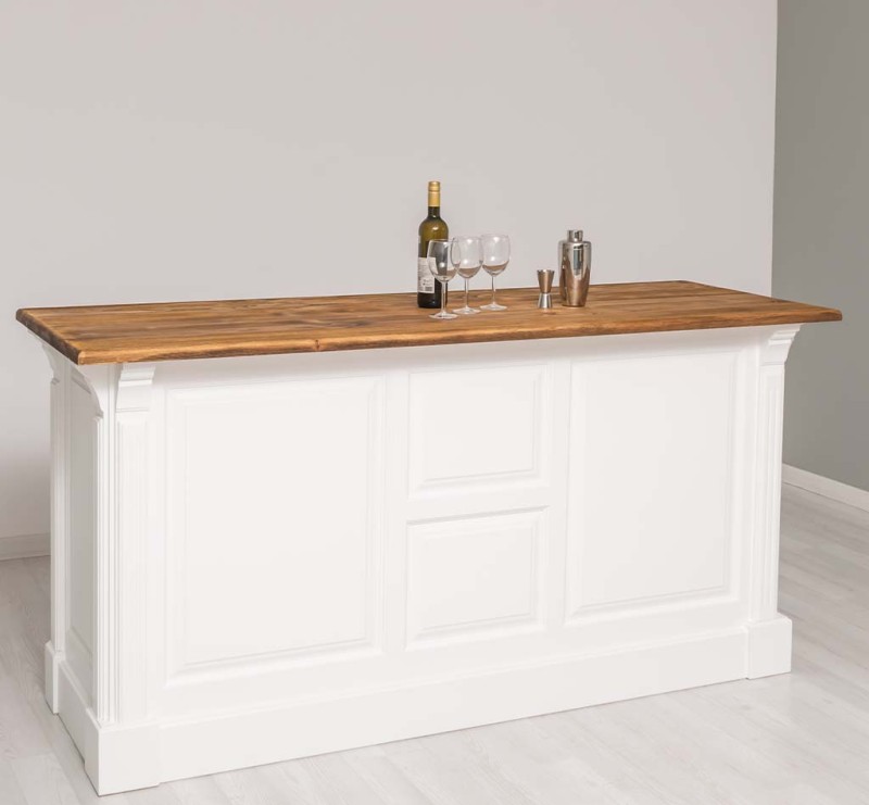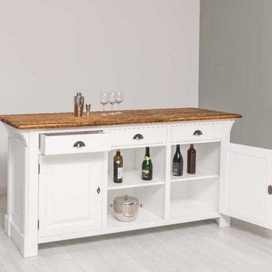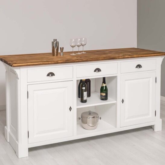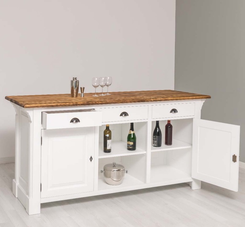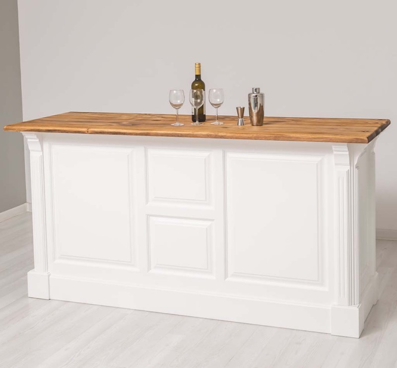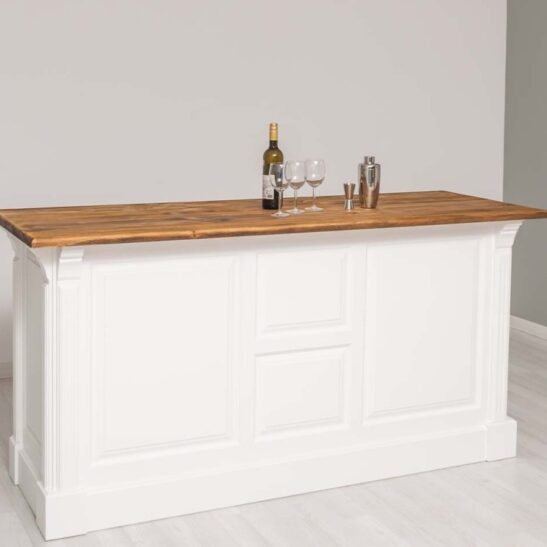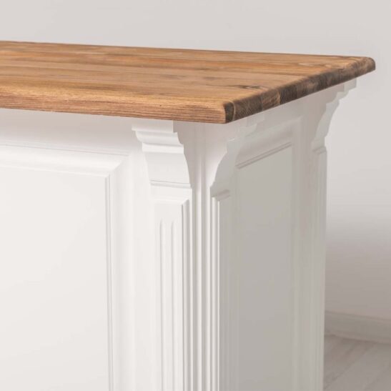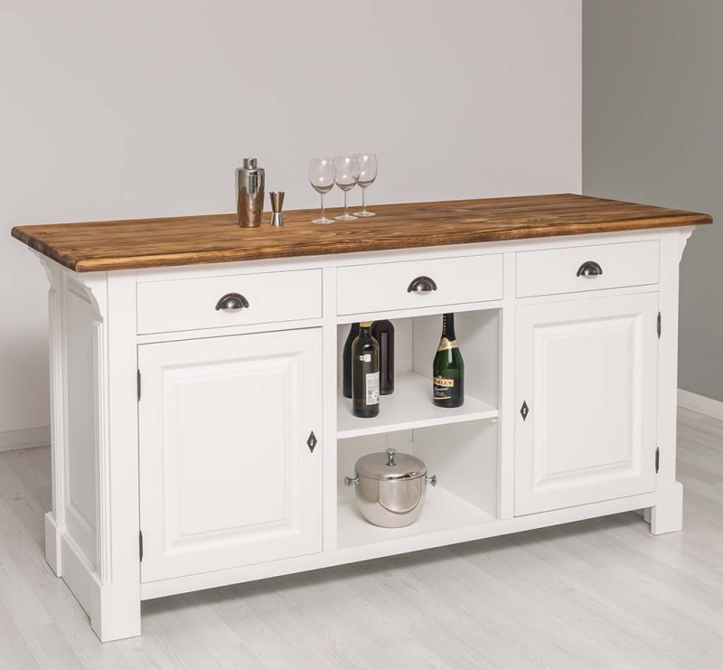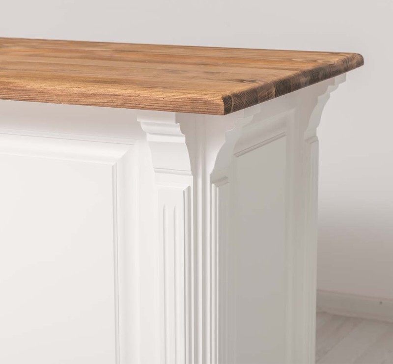 COVENTRY Comptoir îlot 190 cm Vintage en Pin Massif Blanc et Plateau Bois Cendré