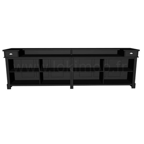 Comptoir vintage large de 360 cm réalisé en pin massif peint en noir, conçu pour allier caractère rétro et solidité professionnelle. Sa structure en bois massif offre une grande surface de service continue, idéale pour un bar, une boutique, une banque d’accueil ou une cuisine professionnelle. Le plateau généreux permet d’accueillir plusieurs postes de travail ou une présentation produit attractive tandis que le dos du meuble propose des rangements pratiques pour tiroirs, étagères et niches (aménagements modulables sur demande). La finition peinture noire mate met en valeur les veines du pin pour un rendu chaleureux et authentique qui s’intègre aussi bien dans un décor industriel que dans un intérieur contemporain. Montage soigné, assemblages renforcés et matériaux choisis pour durer : ce comptoir est pensé pour un usage intensif en point de vente tout en restant facile à entretenir (nettoyage à l’eau savonneuse douce, éviter produits agressifs). Disponible sur mesure, délai de fabrication selon options de finition et aménagement intérieur.