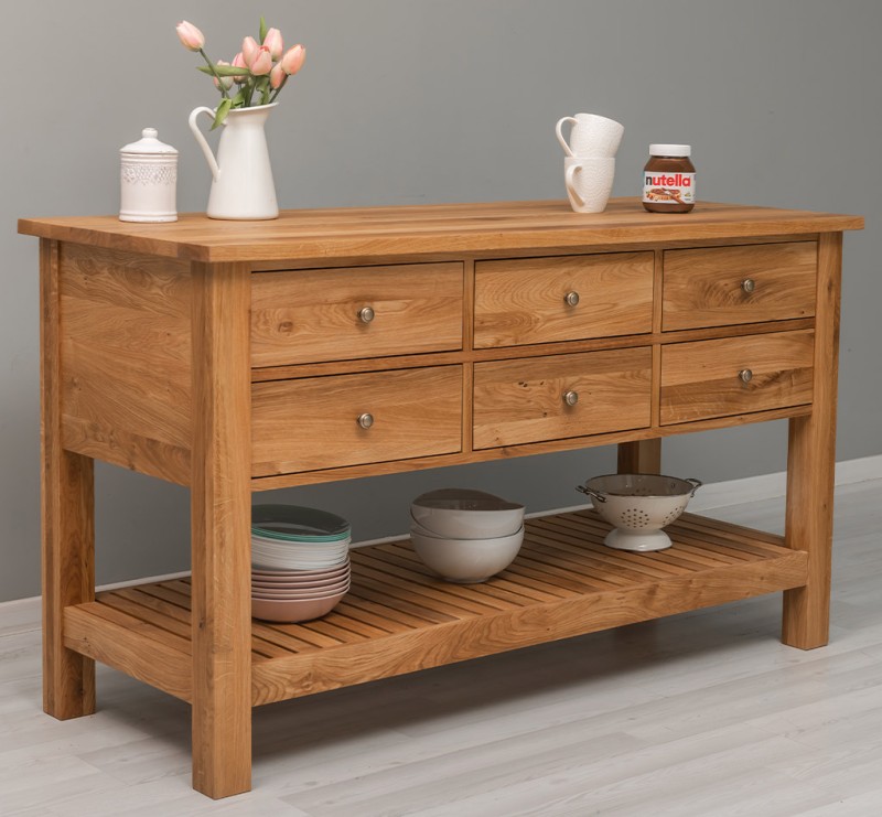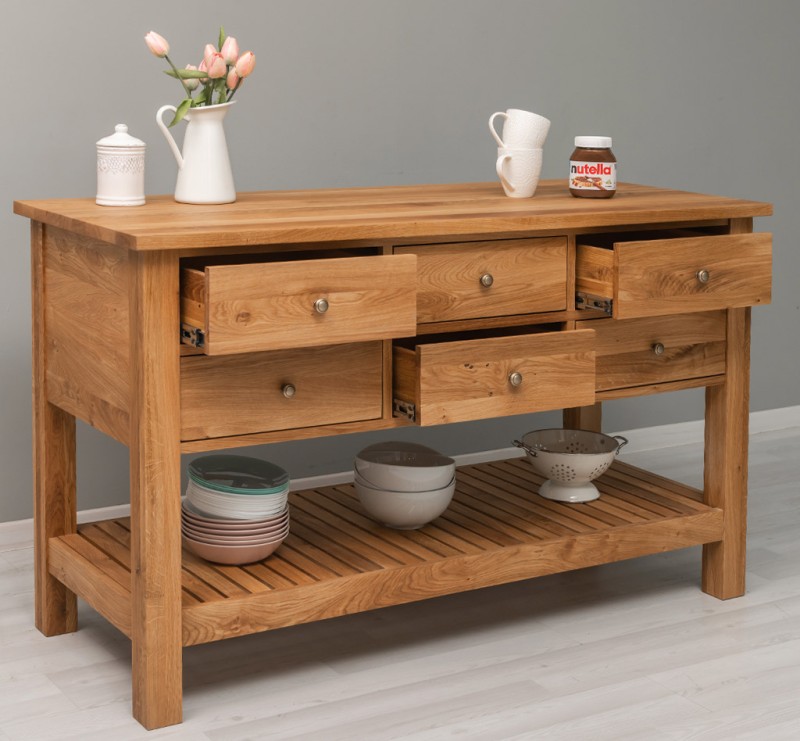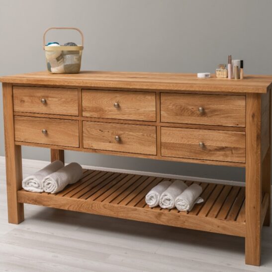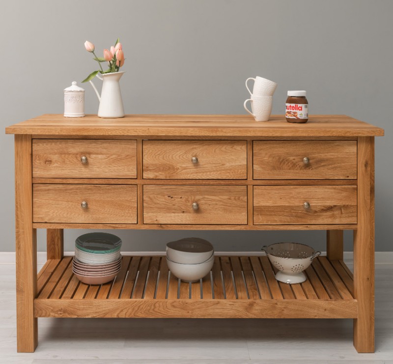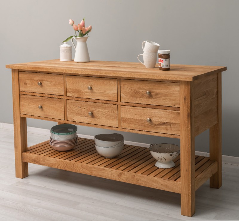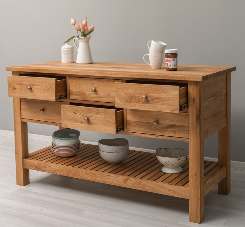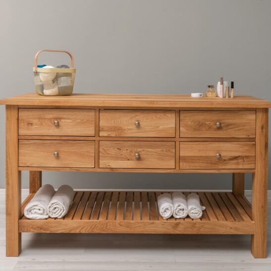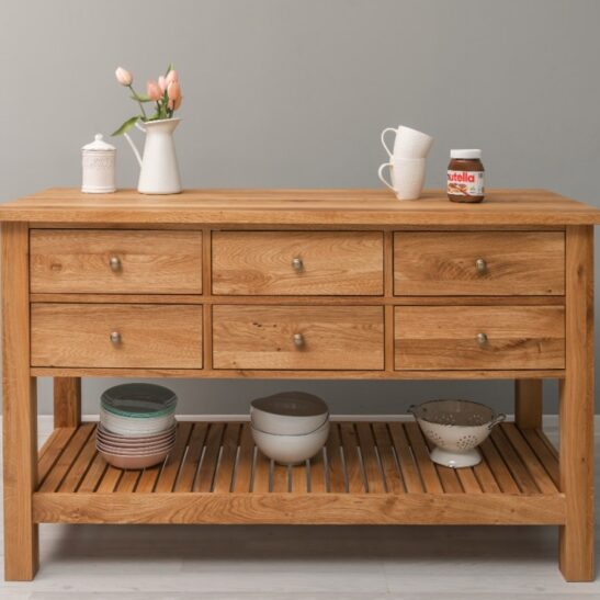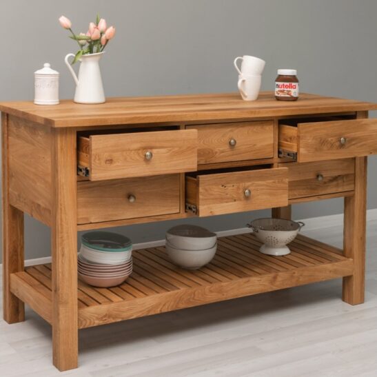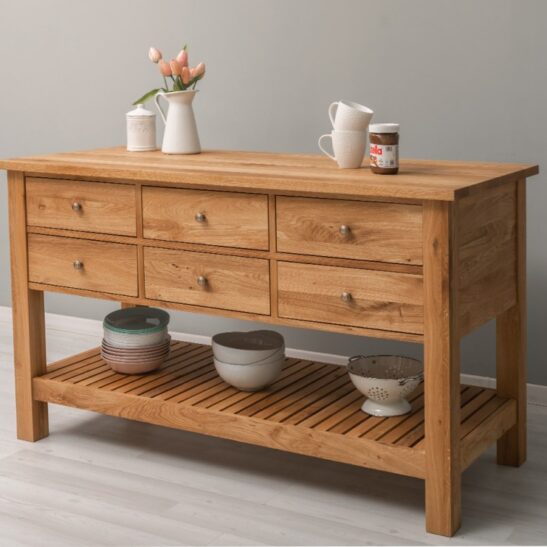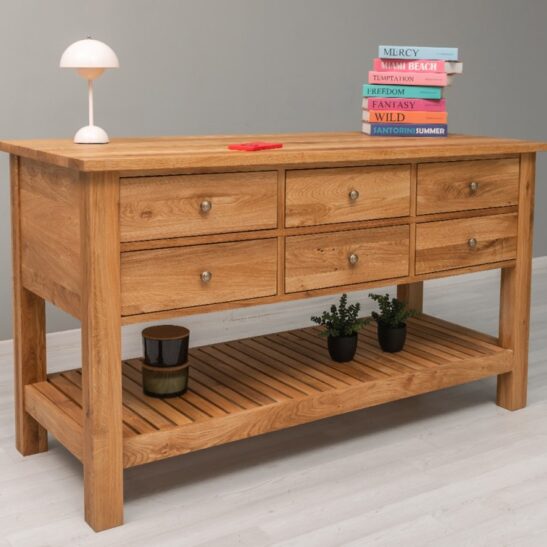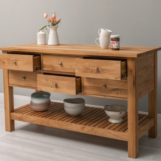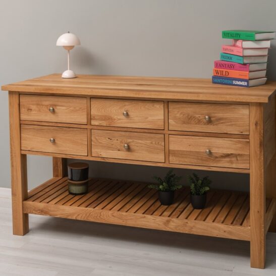 Cette table console en chêne massif incarne l’élégance naturelle et la solidité d’un meuble artisanal. Dotée de six tiroirs spacieux avec poignées métalliques, elle offre un rangement optimal pour la vaisselle, les ustensiles, le linge de table ou les accessoires du quotidien. L’étagère basse ajourée permet de stocker des objets volumineux ou décoratifs tout en apportant légèreté visuelle et praticité. Sa finition en chêne clair met en valeur le veinage naturel, créant une atmosphère chaleureuse et authentique dans votre intérieur. Ce meuble polyvalent s’intègre aussi bien dans une cuisine que dans une salle à manger ou un salon, et sa conception robuste garantit une durabilité exceptionnelle. Alliant fonctionnalité et esthétique, il est idéal pour organiser et sublimer votre espace de vie.