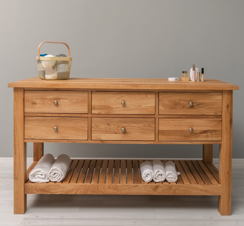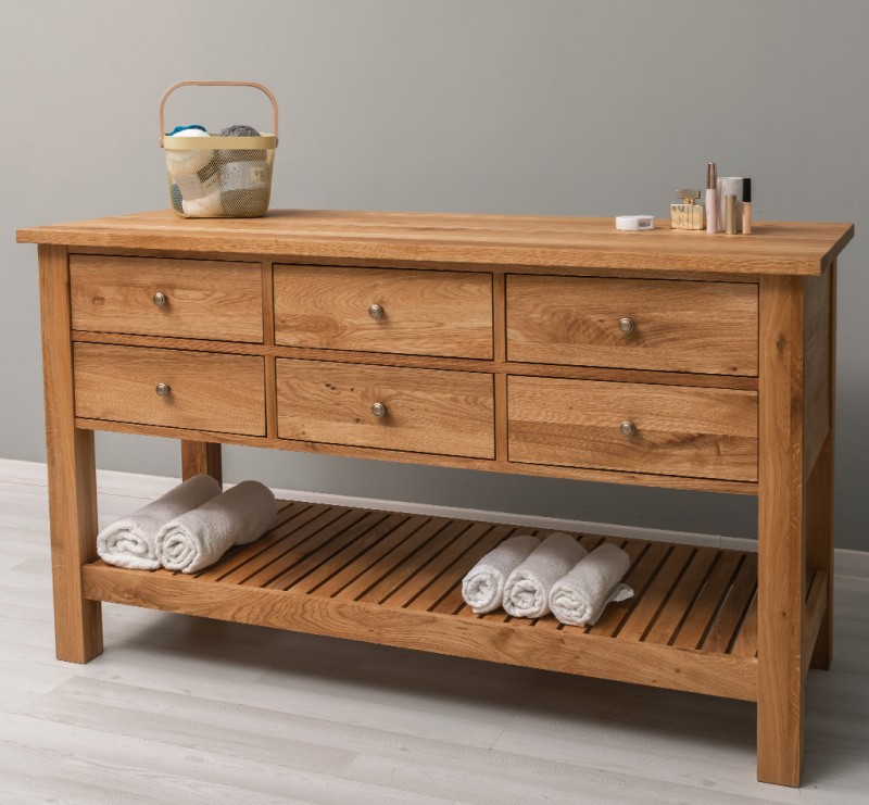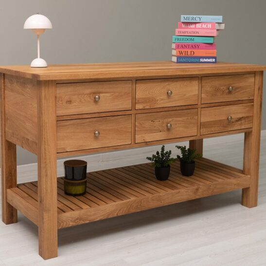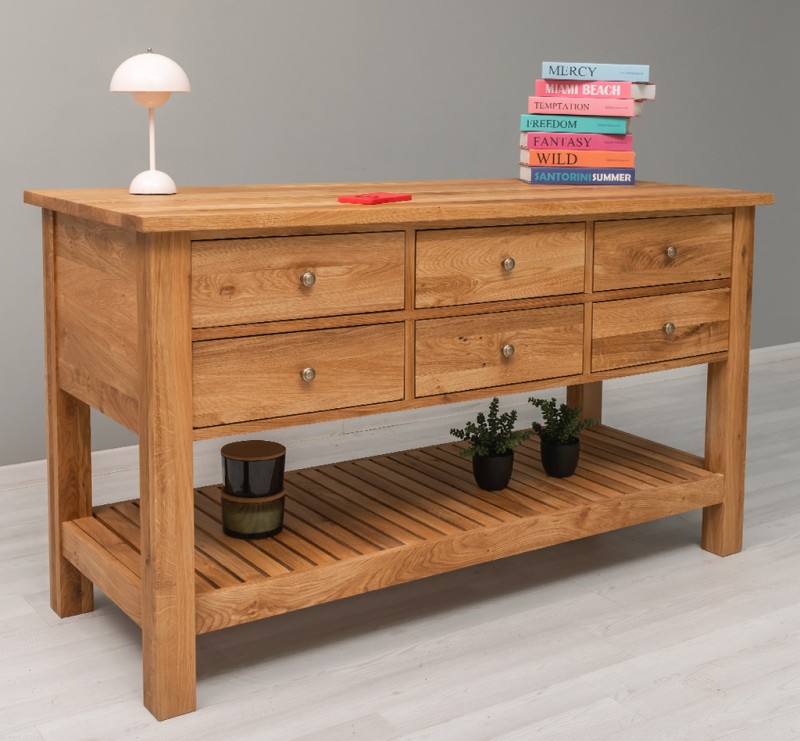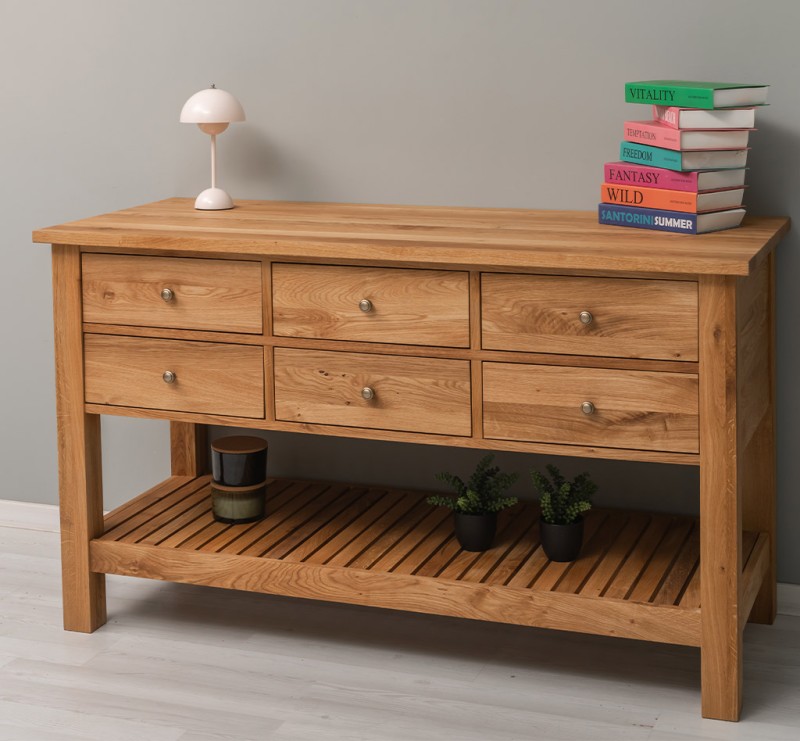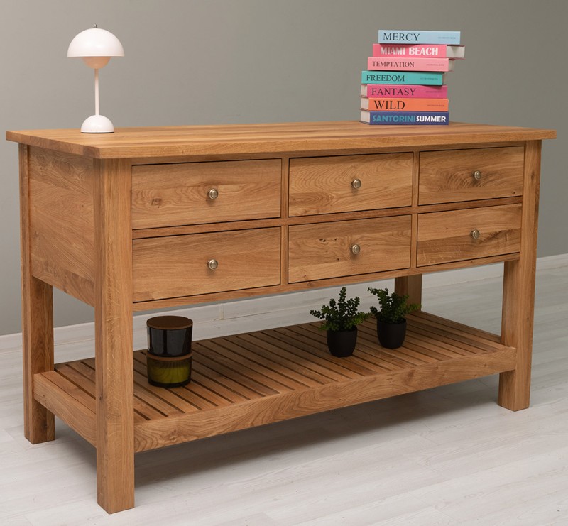 Table console en chêne massif 6 tiroirs avec étagère basse ajourée