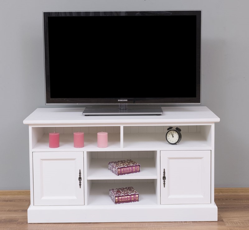Meuble TV en pin massif 2 portes et 4 niches – 129 cm