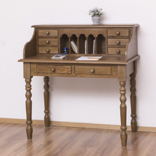 Ce bureau bonheur du jour en pin massif allie charme intemporel et fonctionnalité moderne. Conçu pour offrir un espace de travail agréable et parfaitement organisé, il se distingue par sa structure robuste, ses lignes élégantes et ses nombreux rangements pratiques. Son plateau généreux repose sur quatre pieds tournés qui apportent une touche chaleureuse et authentique à votre intérieur.