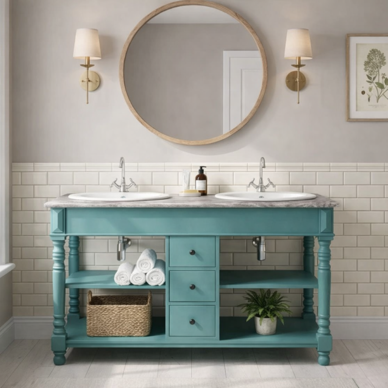 Les vasques à poser et les mitigeurs ne sont pas inclus et peuvent être achetés si nécessaire. Offrez à votre salle de bain un meuble sous-vasque double en pin massif de 150 cm, alliant robustesse et esthétique chaleureuse. Fabriqué en pin massif sélectionné, ce meuble garantit une structure stable et durable adaptée à un usage quotidien. Sa largeur de 150 cm permet d’accueillir deux vasques et offre un plan de travail généreux pour l’installation de robinets et accessoires. Le design privilégie la fonctionnalité : deux grands tiroirs coulissants, une ou deux niches intérieures selon configuration, et une gestion discrète des passages de plomberie pour un rangement optimisé. Les finitions disponibles (vernis naturel, lasure, laque mate ou brillante) et le choix de poignées (métal brossé, bois assorti) permettent d’adapter le meuble à tous les styles. Chaque pièce est poncée et traitée pour résister à l’humidité ambiante d’une salle de bain, et les assemblages sont réalisés pour garantir une longue durée de vie. Ce meuble convient aussi bien aux projets de rénovation qu’aux nouvelles installations, offrant un excellent rapport qualité‑prix pour un meuble en bois massif. Dimensions, options de finition et accessoires (vasques, mitigeurs, miroir assorti) sont disponibles sur demande pour composer un ensemble harmonieux et fonctionnel. (éviers et robinetteries non inclus).