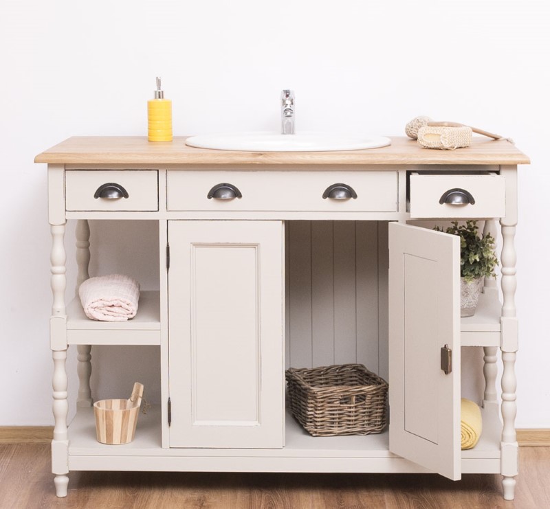 Meuble sous vasque ajouré en pin massif 128 cm avec pieds tournés – vasque et robinetterie non inclus