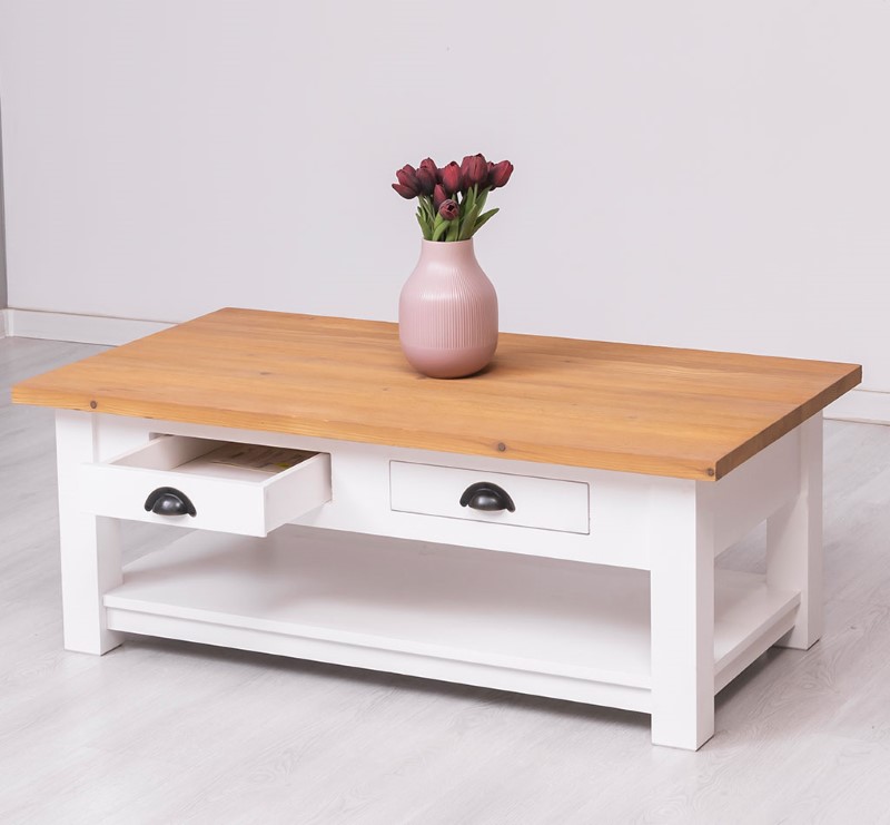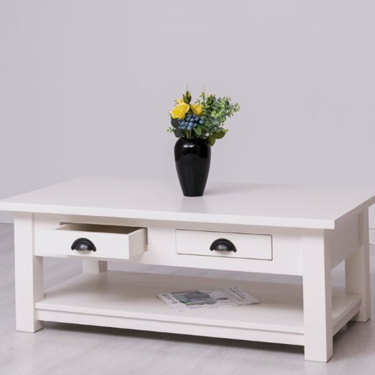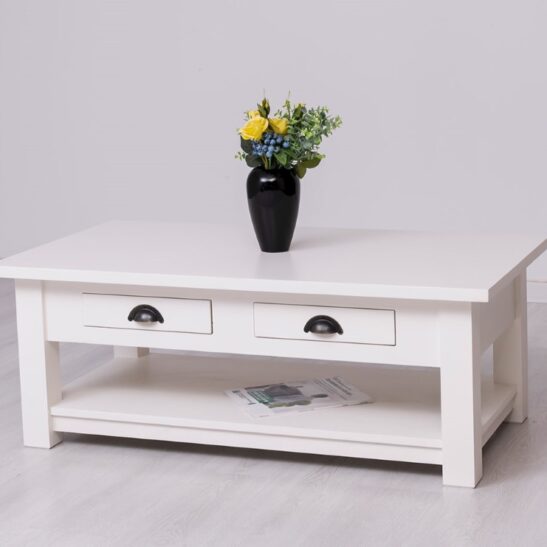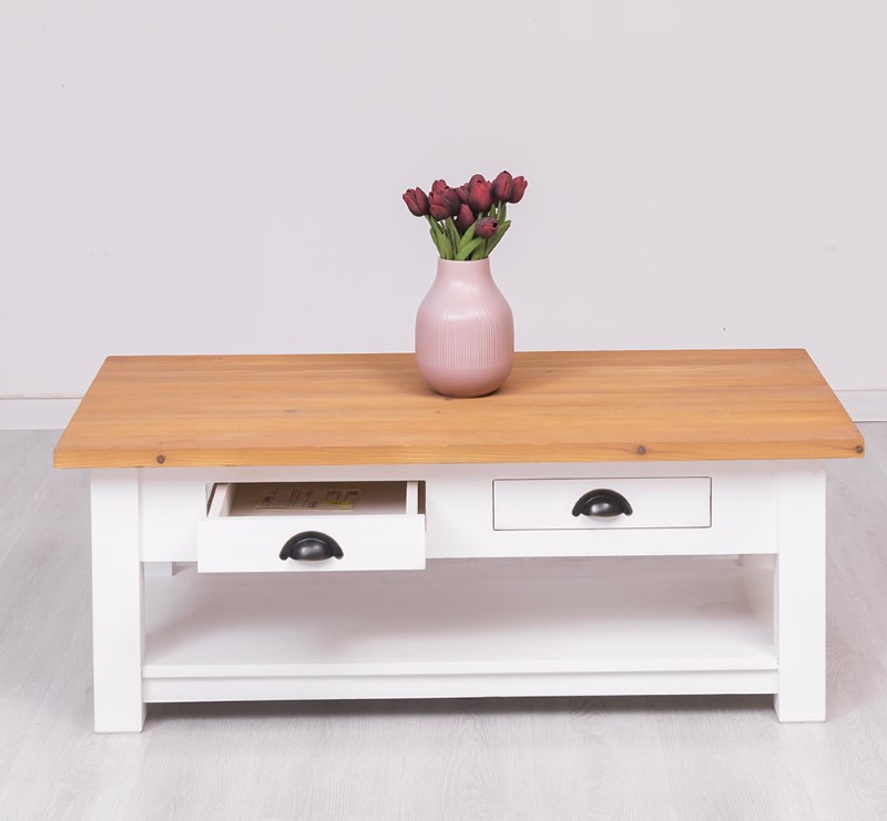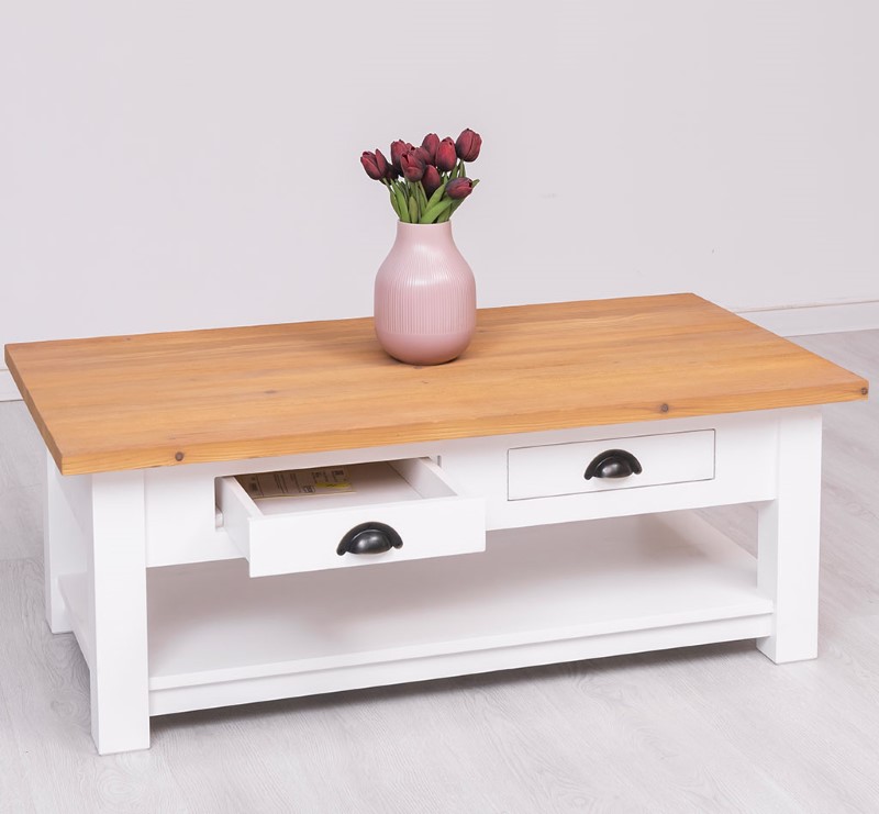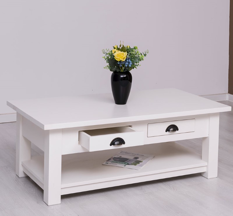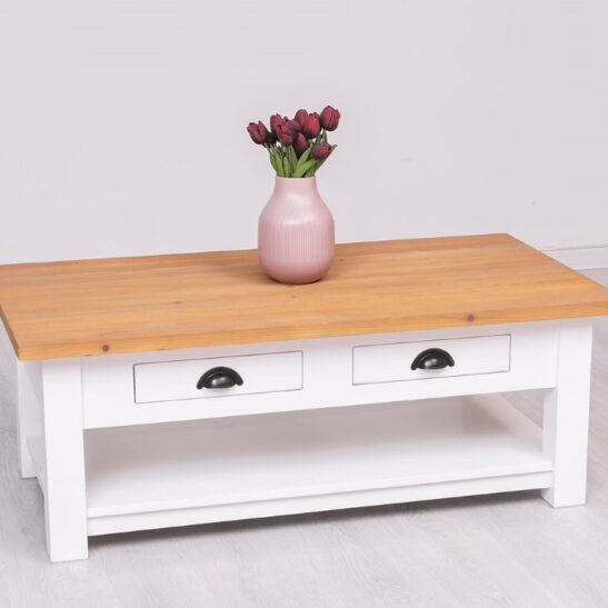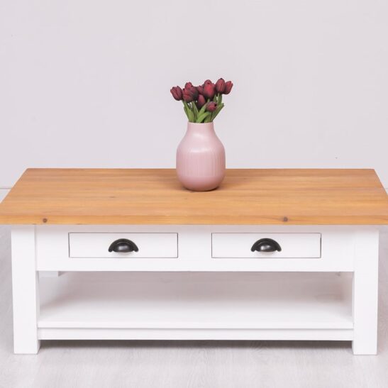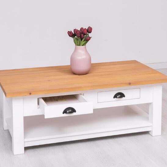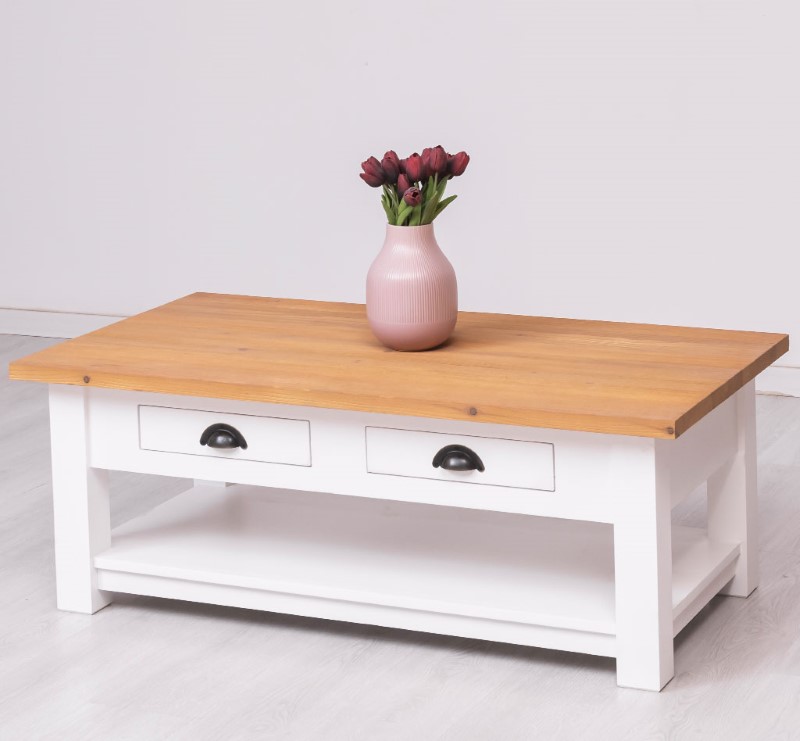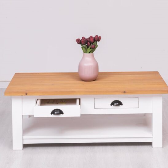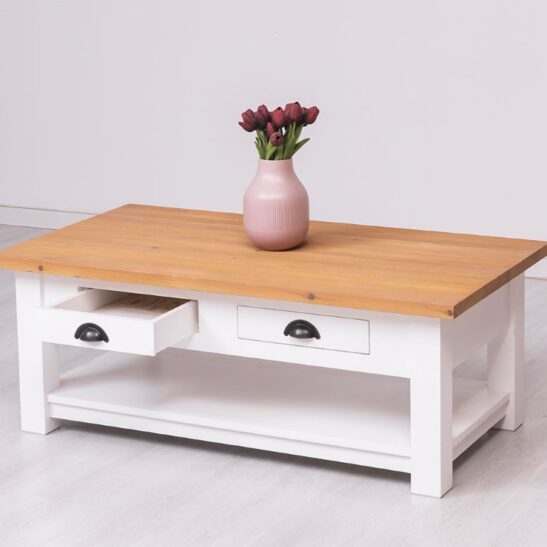 Table basse en pin massif à deux tiroirs 120×65 cm