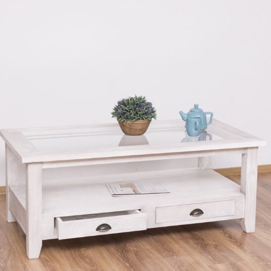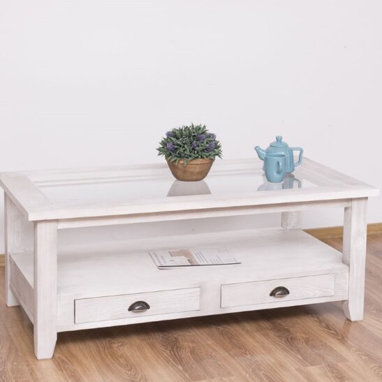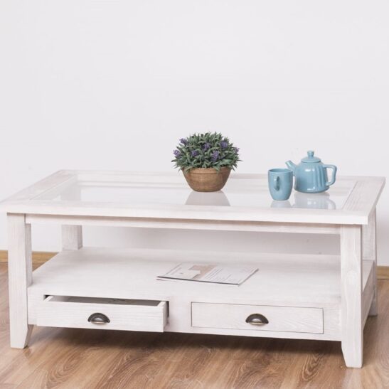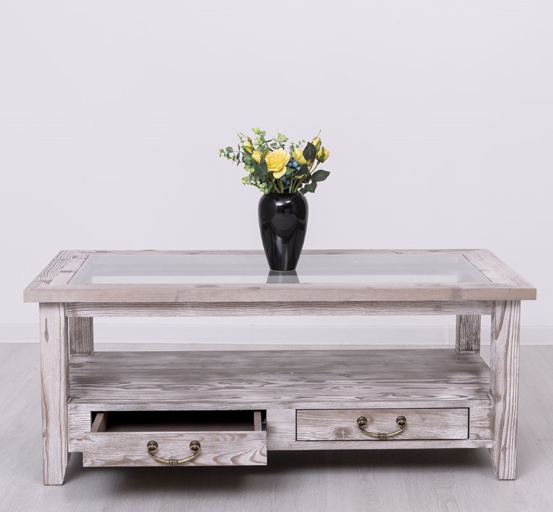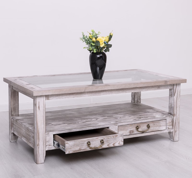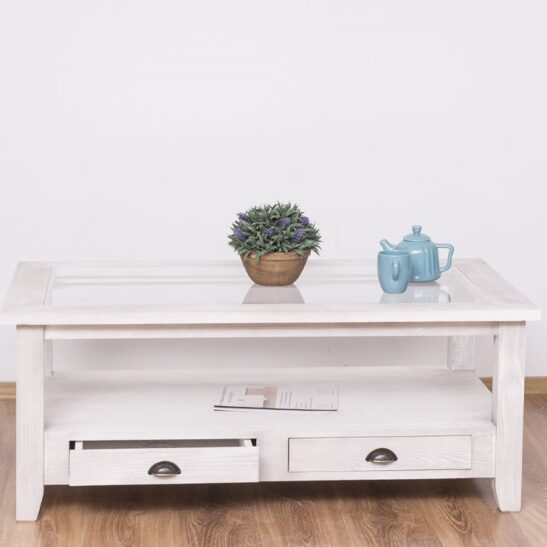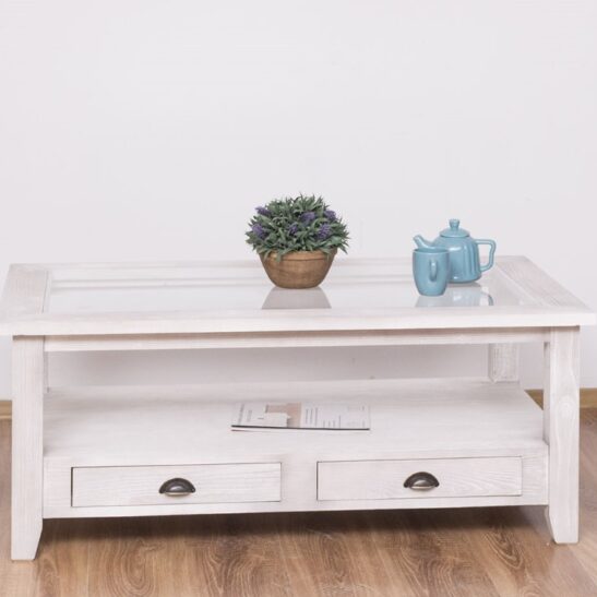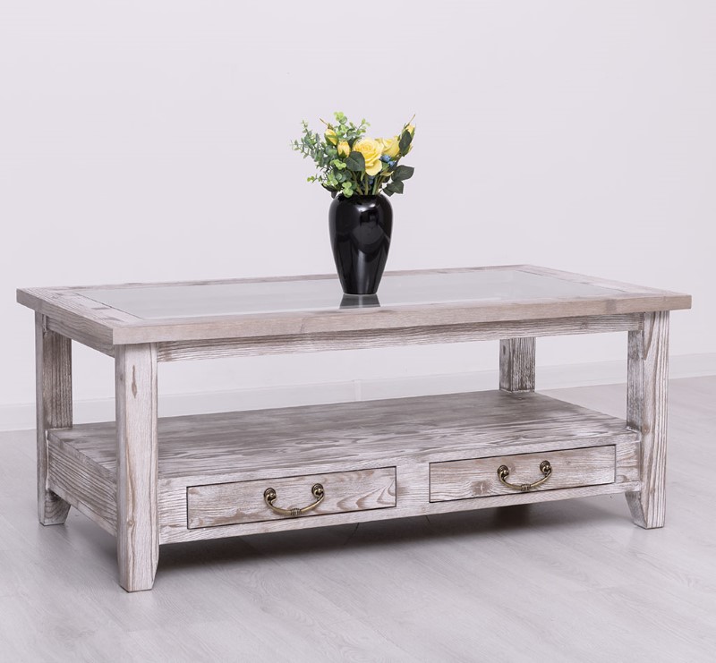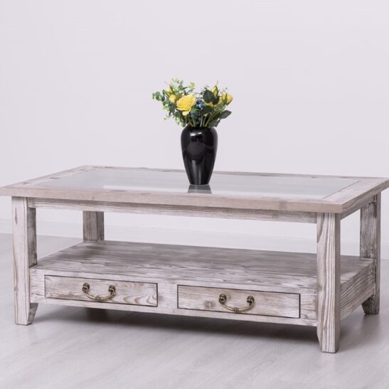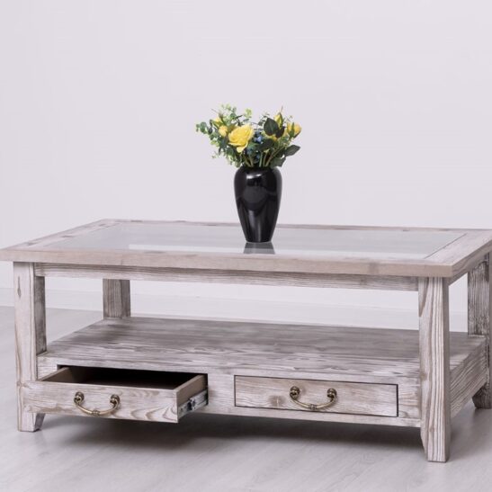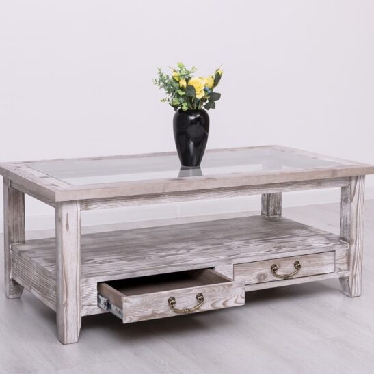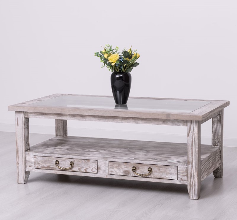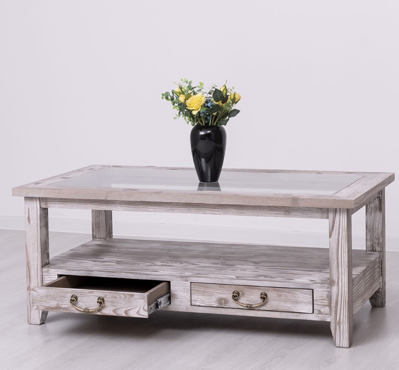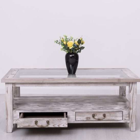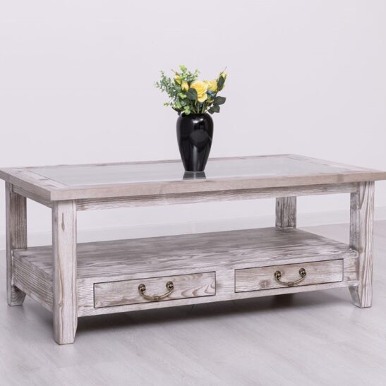 Table basse en pin massif avec 2 tiroirs et plateau verre 120×65