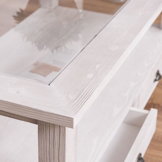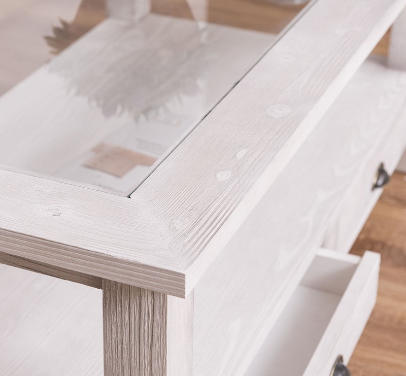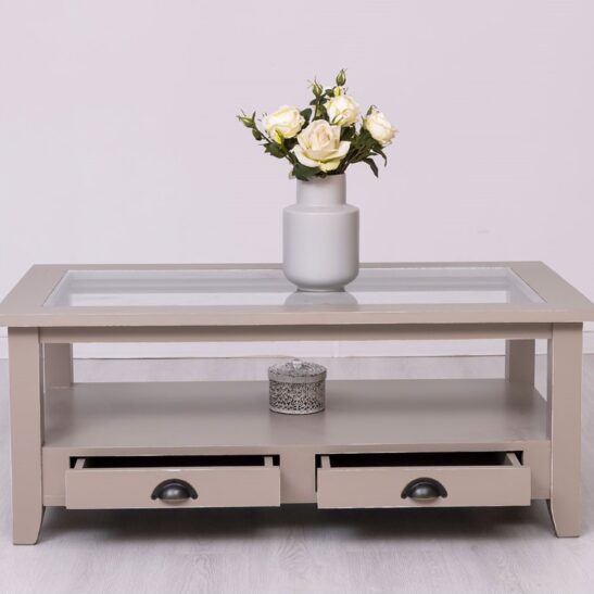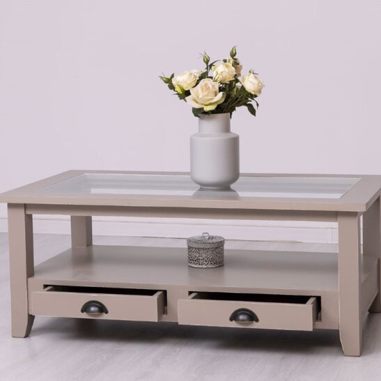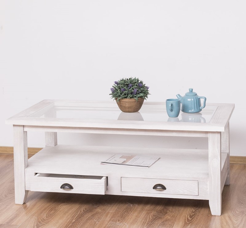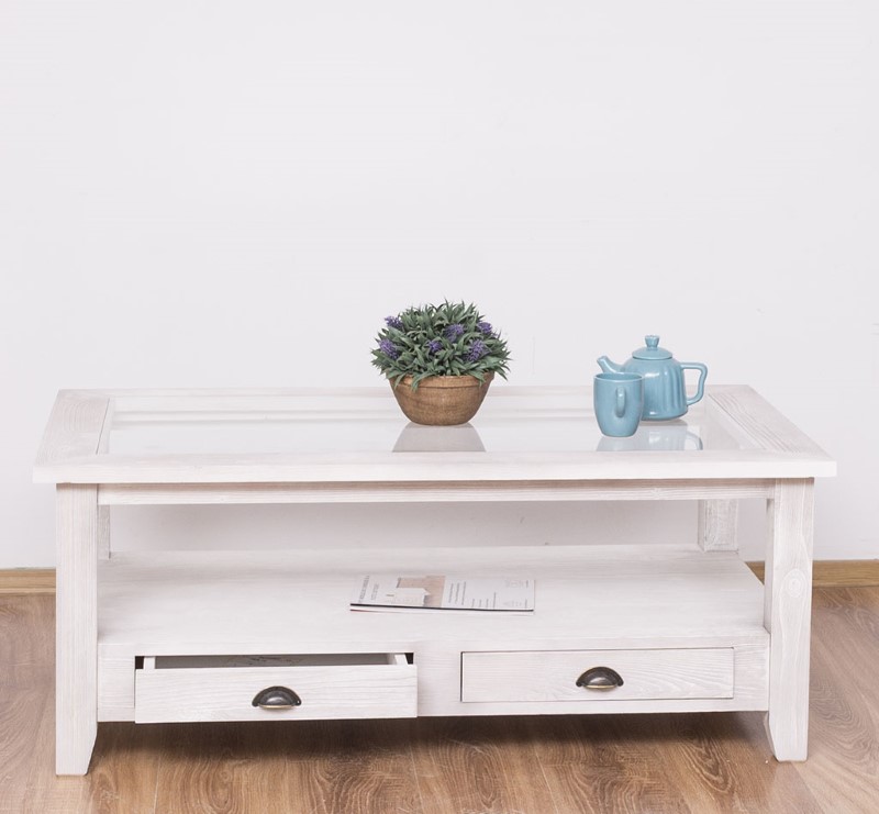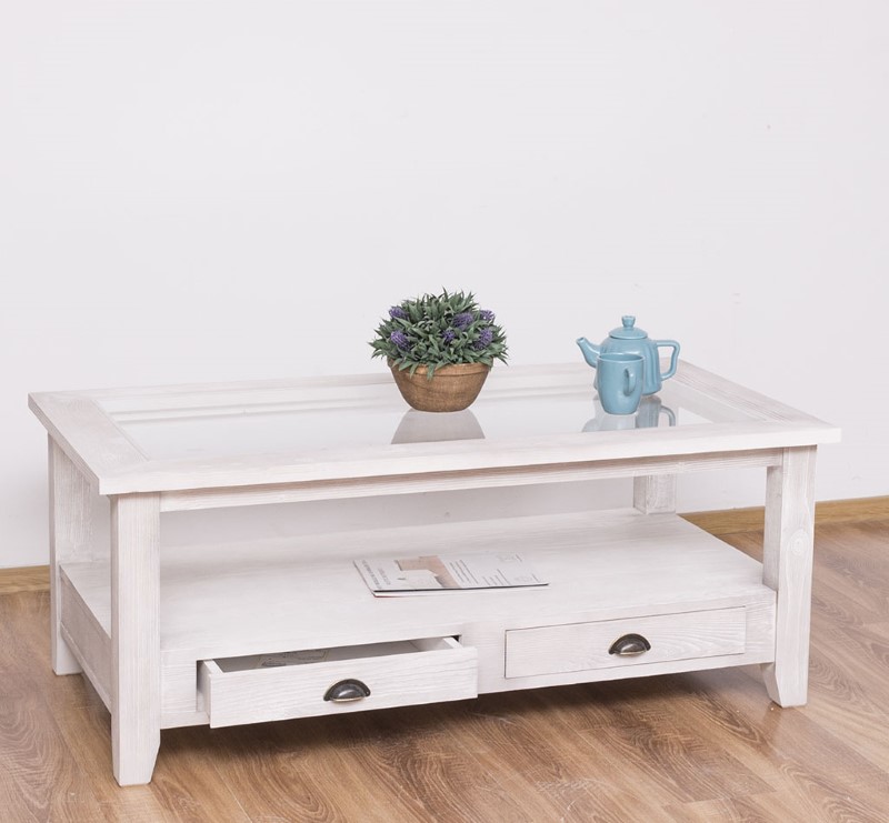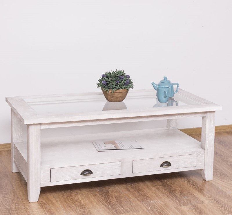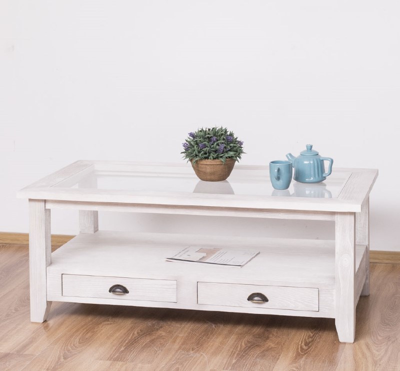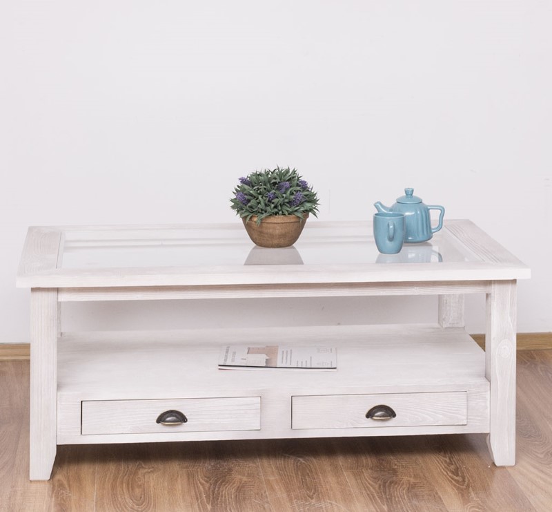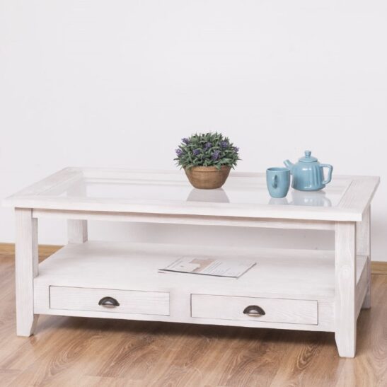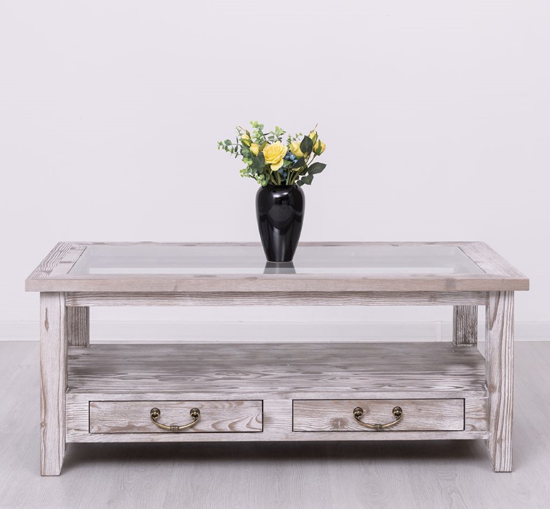 Table basse en pin massif avec 2 tiroirs et plateau verre 120×65