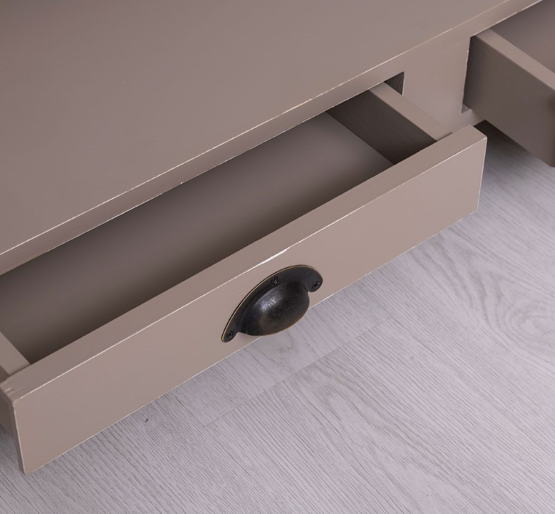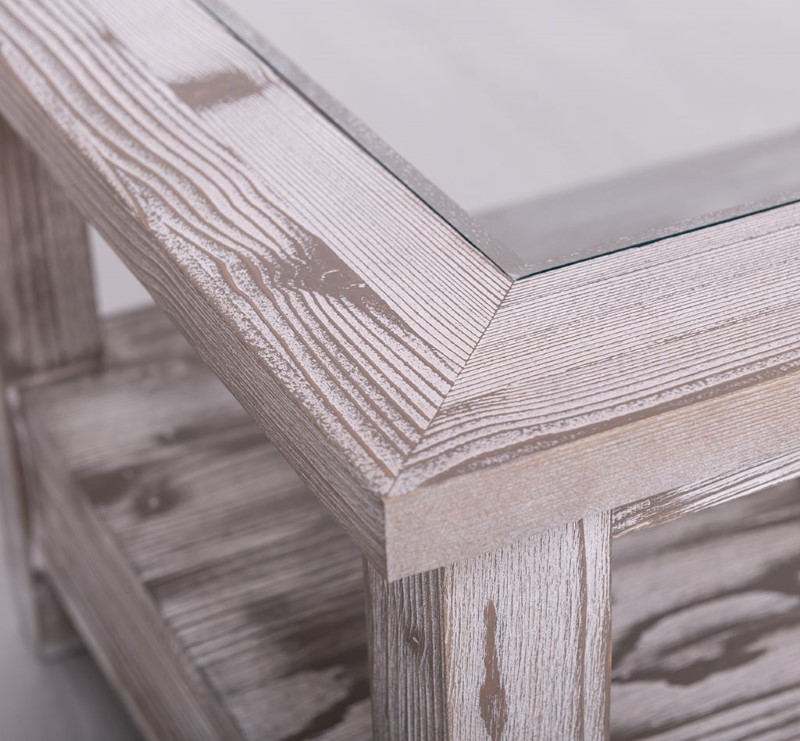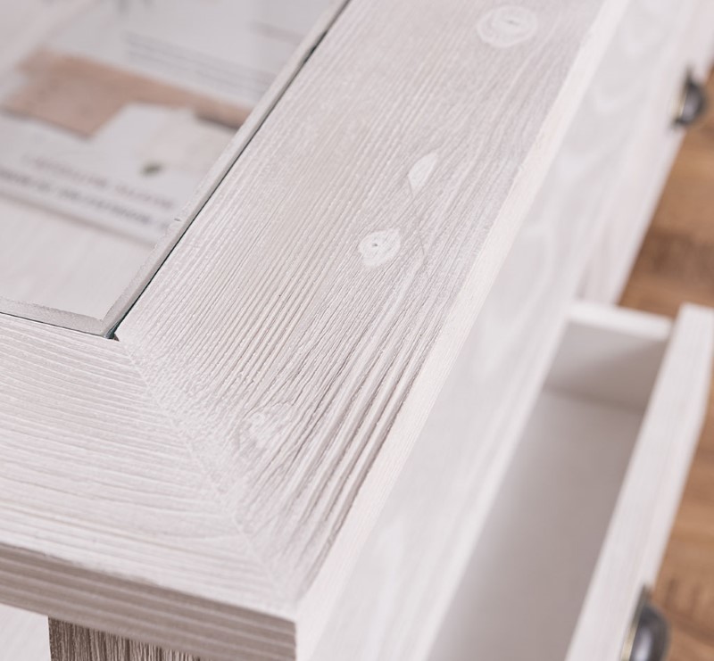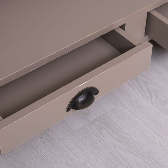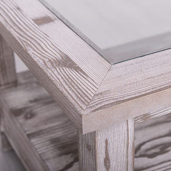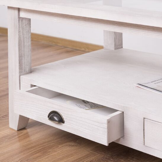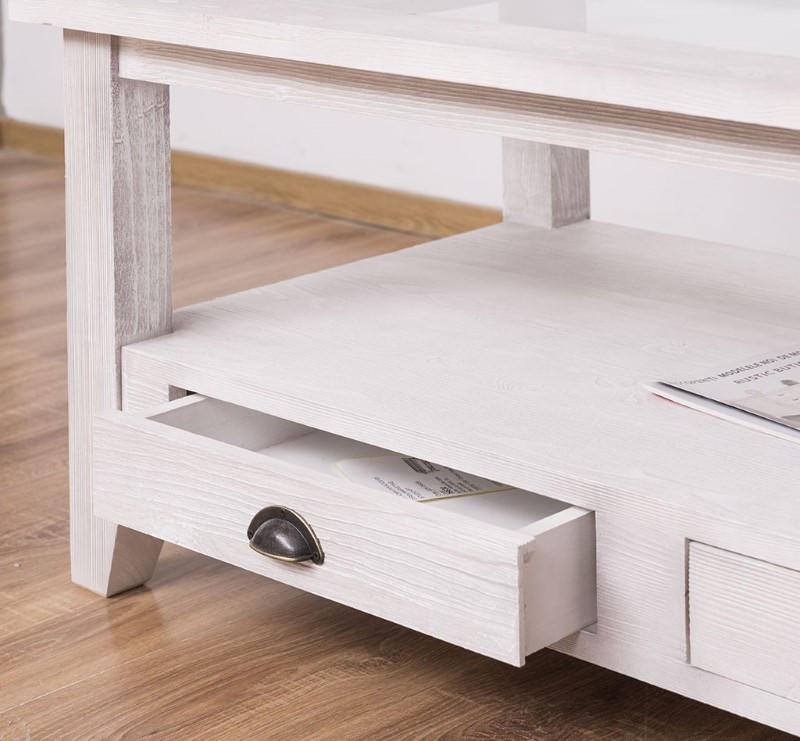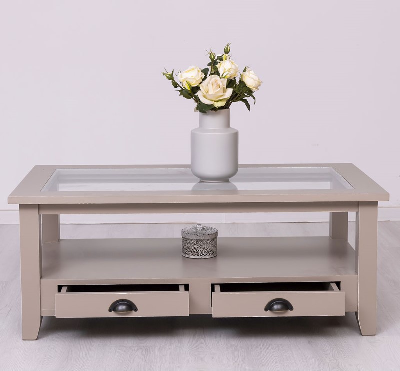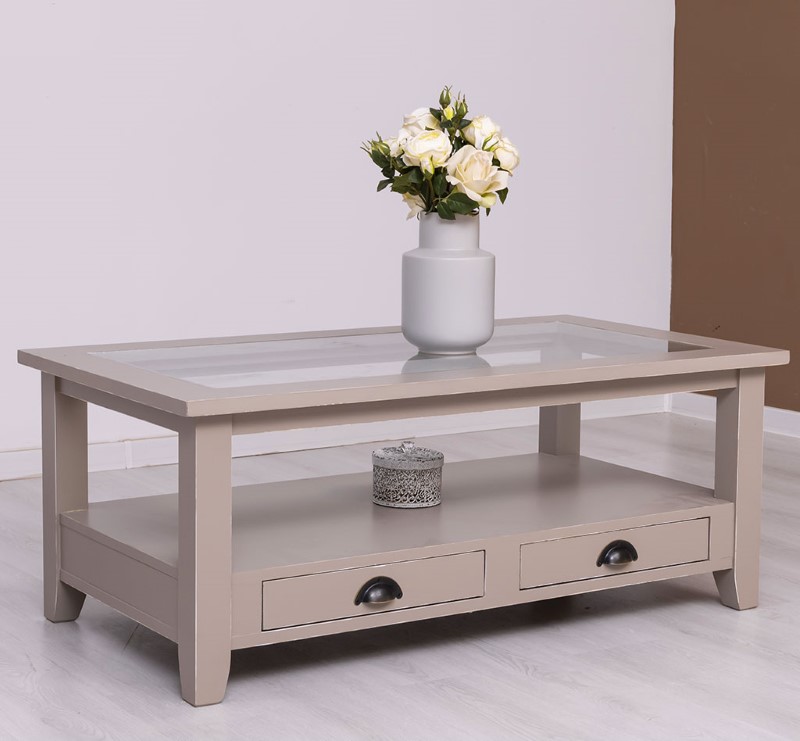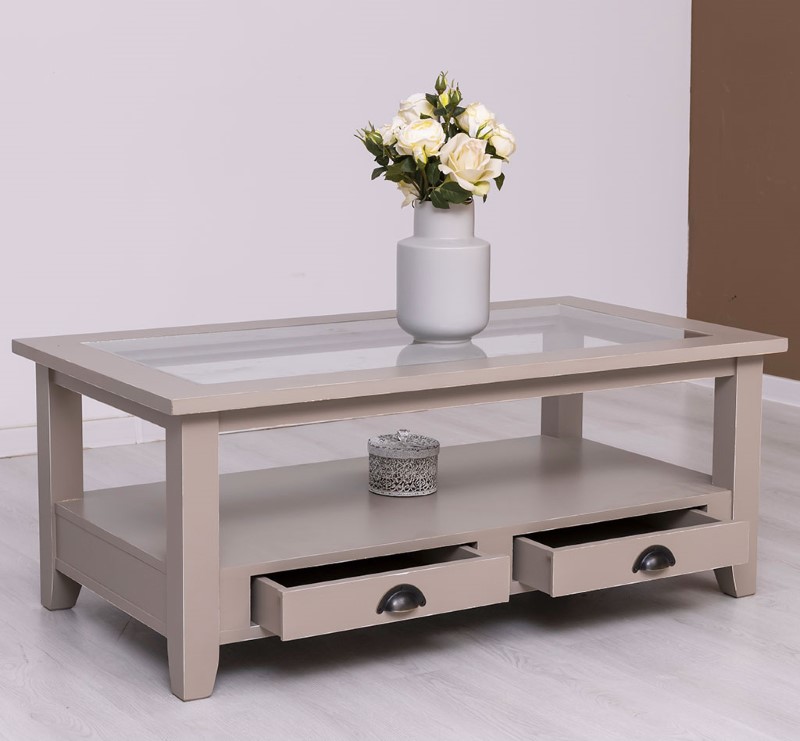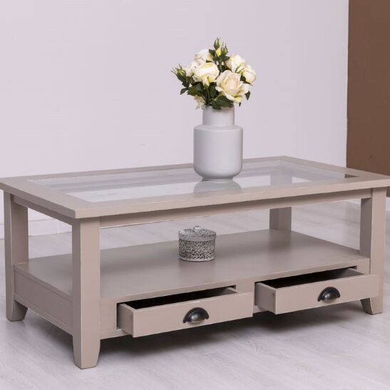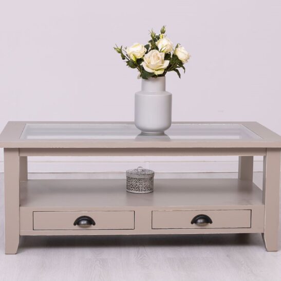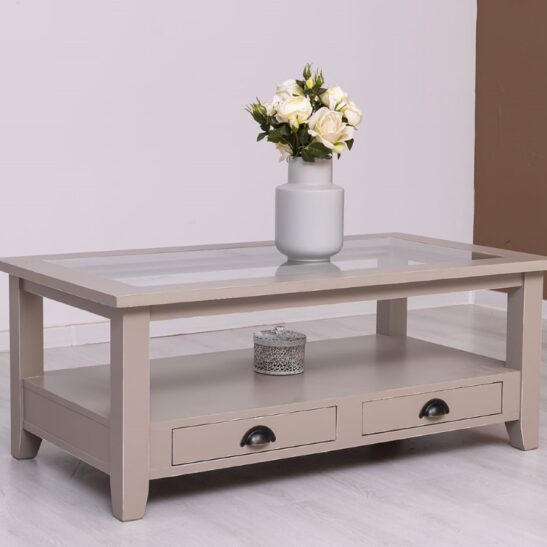 Table basse en pin massif avec 2 tiroirs et plateau verre 120×65
